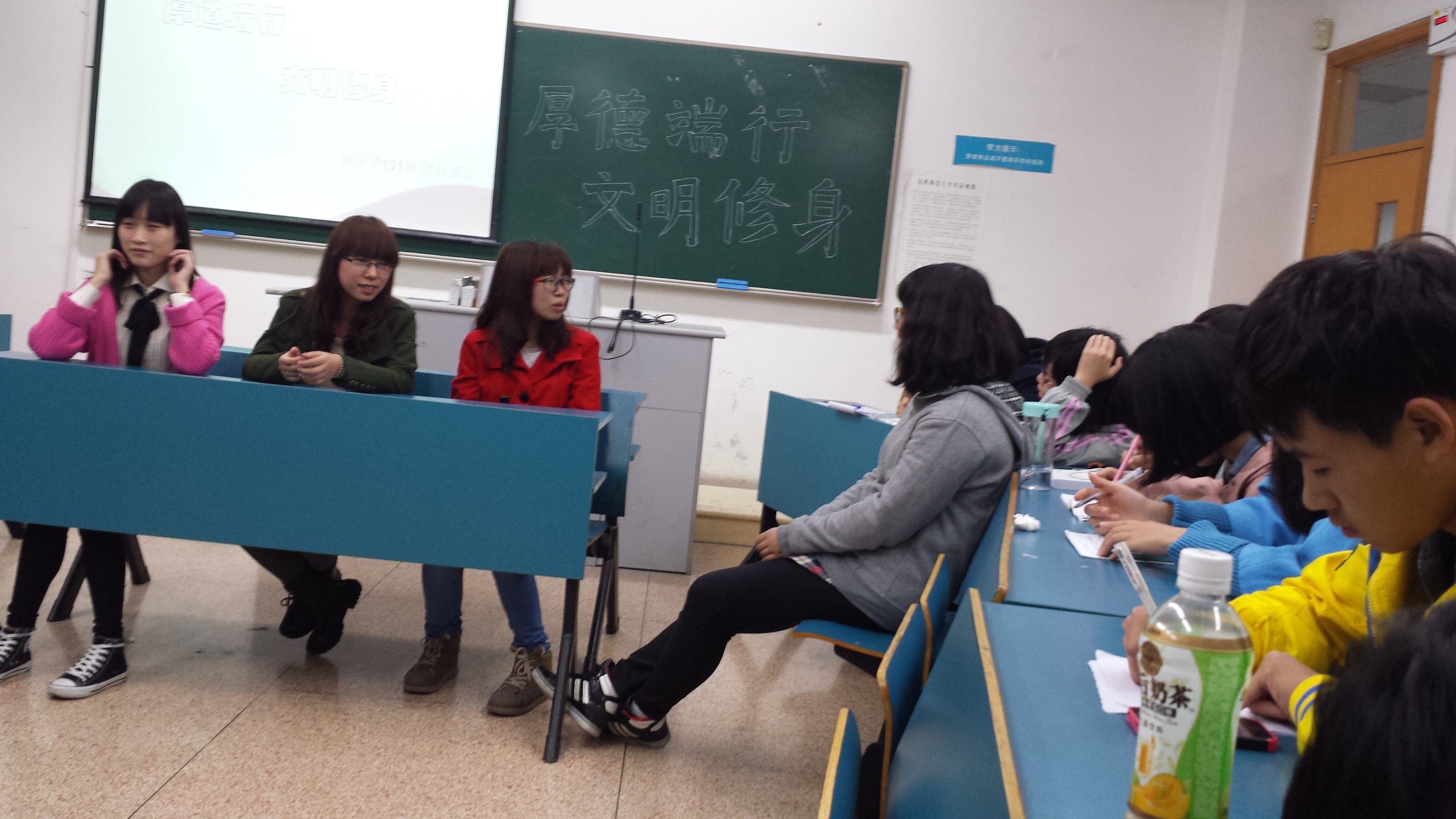 高分子131班主题团日活动在A楼503教室准时开展,党员池莉、王超颖、施逸凌三人应邀出席活动。 活动伊始,团支书带领同学们观看“2013感动中国”的视频,其中陈斌强老师带母上课和何玥同学无偿捐献器官的事迹令同学们大为感动。观看视频后,同学们感触颇多,林青青同学在发表感想时说道:“通过这些感人事迹,我充分领悟到了爱与善良的真谛,我充分了解到了道德的力量有多伟大,我希望在今后生活中能认真做到厚德、端行”。其他同学也深有感触,都先后发表了自己观看视频后的感想以及对“厚德端行,文明修身”的理解。 在热烈的掌声中,党员嘉宾池莉、王超颖、施逸凌等三位11级学姐应邀入席,与13级的学弟学妹们交流身为党员在平时生活学习工作中的经验。王超颖学姐率先发言,她用生活中的实际例子向同学们讲解了如何做到厚德端行,文明修身。施逸凌学姐在随后的发言中也说道:“厚德与文明并不是一定要做多么惊天动地的大事,完全可以从生活小事做起,从身边的一点一滴做起。”池莉学姐则是着重强调了礼仪礼貌的重要性,并亲自给同学们做了递名片的动作演示。在之后的提问环节中,同学们踊跃提问,就自己关心的入党、时间规划等问题进行了提问,学姐们都一一耐心解答并给予建议与鼓励。 最后,团支书对本次活动进行了总结,并在班级里发起了“中国好室友”活动,号召同学们从寝室做起,厚德端行,文明修身,关爱室友,积极为室友服务。