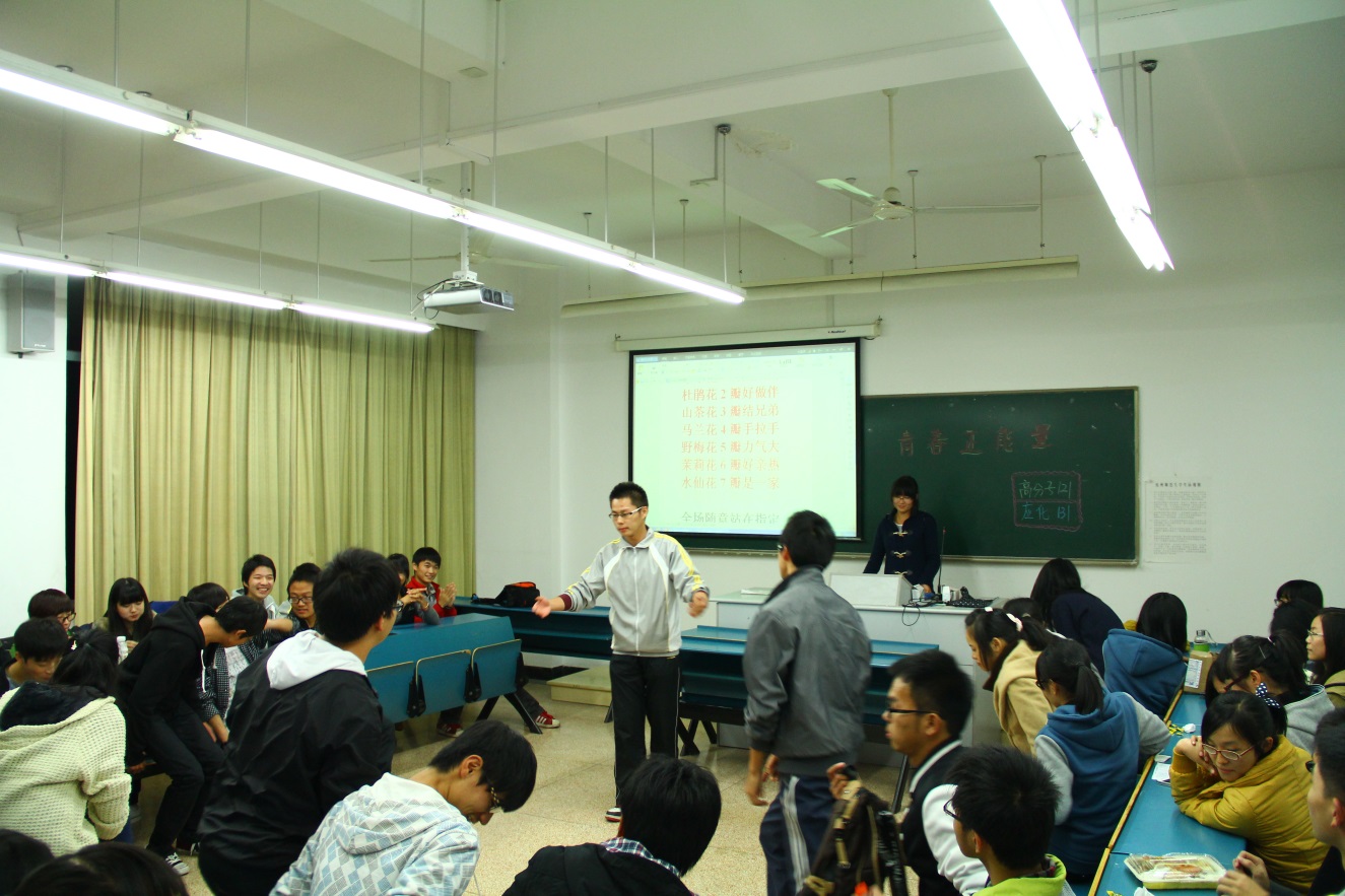 活动伊始,两班同学以万花筒游戏打头,营造了和谐活泼的活动气氛,在欢声笑语中嬉戏并结识。第二环节直奔主题—“青春正能量”。主持人播放了与主题有关的PPT,指出了正能量的概念,在同学们关于正能量的琅琅读书声中,将正能量这个概念植入脑海。而后主持人又展示出她在校园内发现的一些与正能量有关的图片,旨在指引大家善于发现身边存在的正能量,从点滴做起。