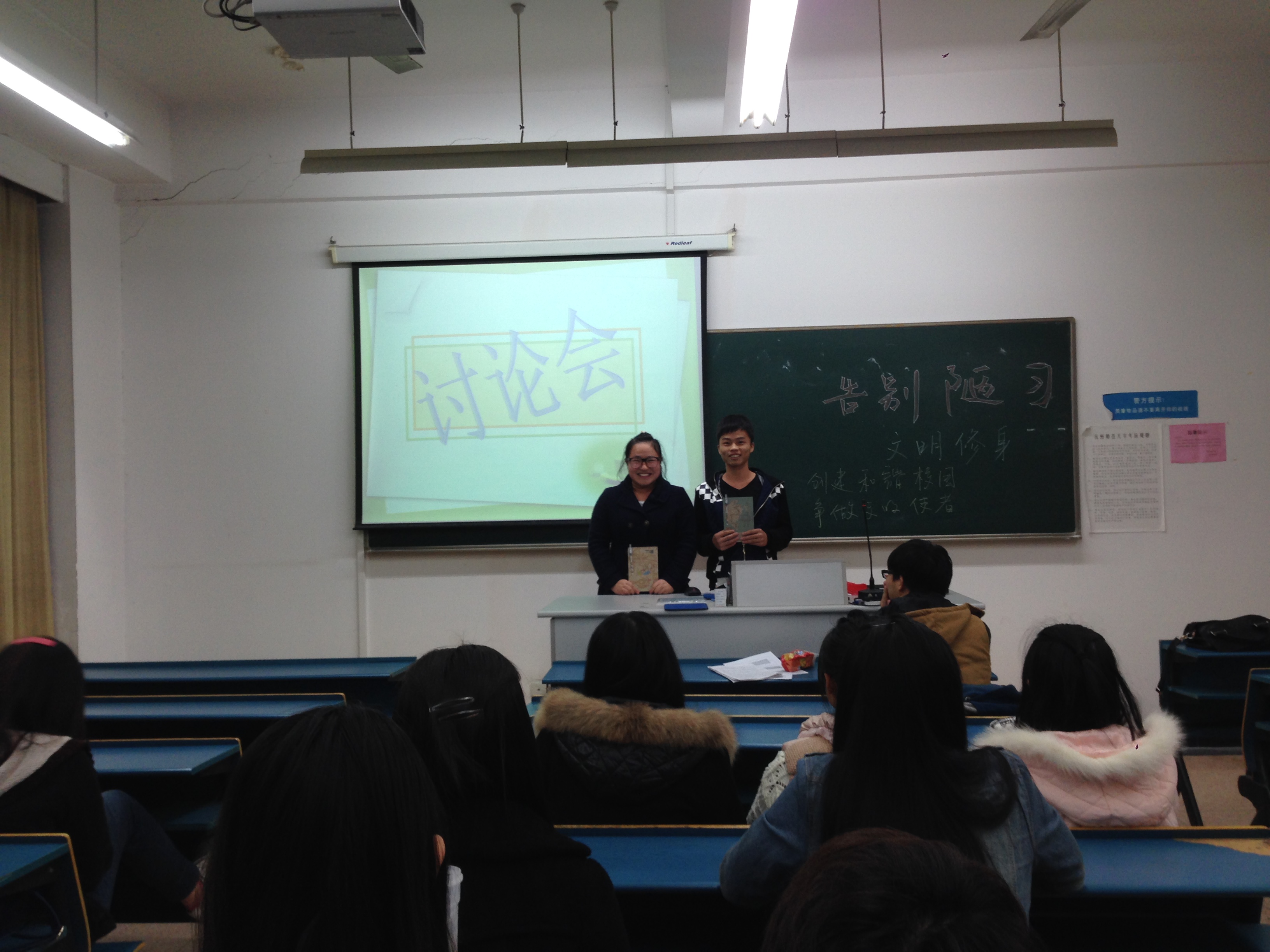 在团支书简单地介绍了本次团日活动主题“告别陋习,文明修身,创建和谐校园,争做文明使者”的相关内涵后,便开始依次播放同学们分工合作、精心拍摄的视频。本次拍摄视频的地点主要是食堂、教室、图书馆、寝室和马路。每个视频的时间虽然不长,但是却将主要的不文明行为展现得淋漓尽致,引起了同学们的强烈关注。每一段视频播放后都会由拍摄者总结该地点所发生的不文明现象,并提出相关的解决办法。最后,在团支书的带领下,全班起立郑重宣誓——作为应化111班的一份子,要告别陋习,文明修身,创建和谐校园,争做文明使者。