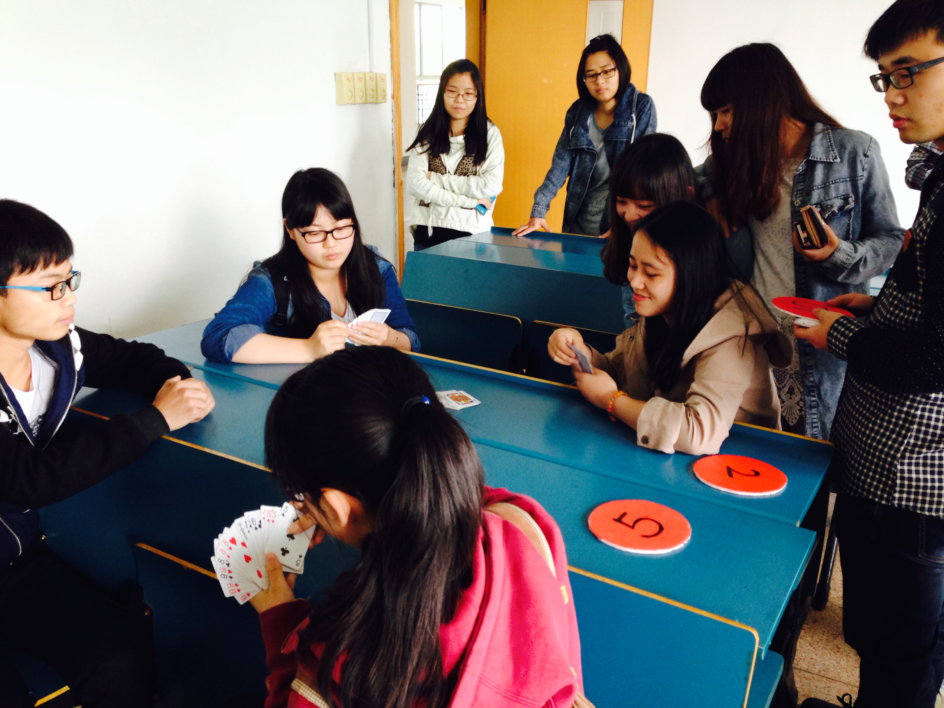 本次棋牌大赛是由五子棋、象棋和双扣三部分组成,采取淘汰制的方法,30多名选手在激烈的角逐中一较高下。赛事进行过程中,选手们深陷僵局,不急不躁,沉着应对;遭遇平局,把握时机,主动出击。本着“切磋技艺,以赛会友”的原则,秉持“友谊第一,比赛第二”的精神,选手们表现出良好的竞技状态。此次比赛也吸引了许多学生前来观看,围观群众认真关注形势,并且都自觉地保持安静,甚至有一组同学因受气氛感染而临时组队加入比赛。
