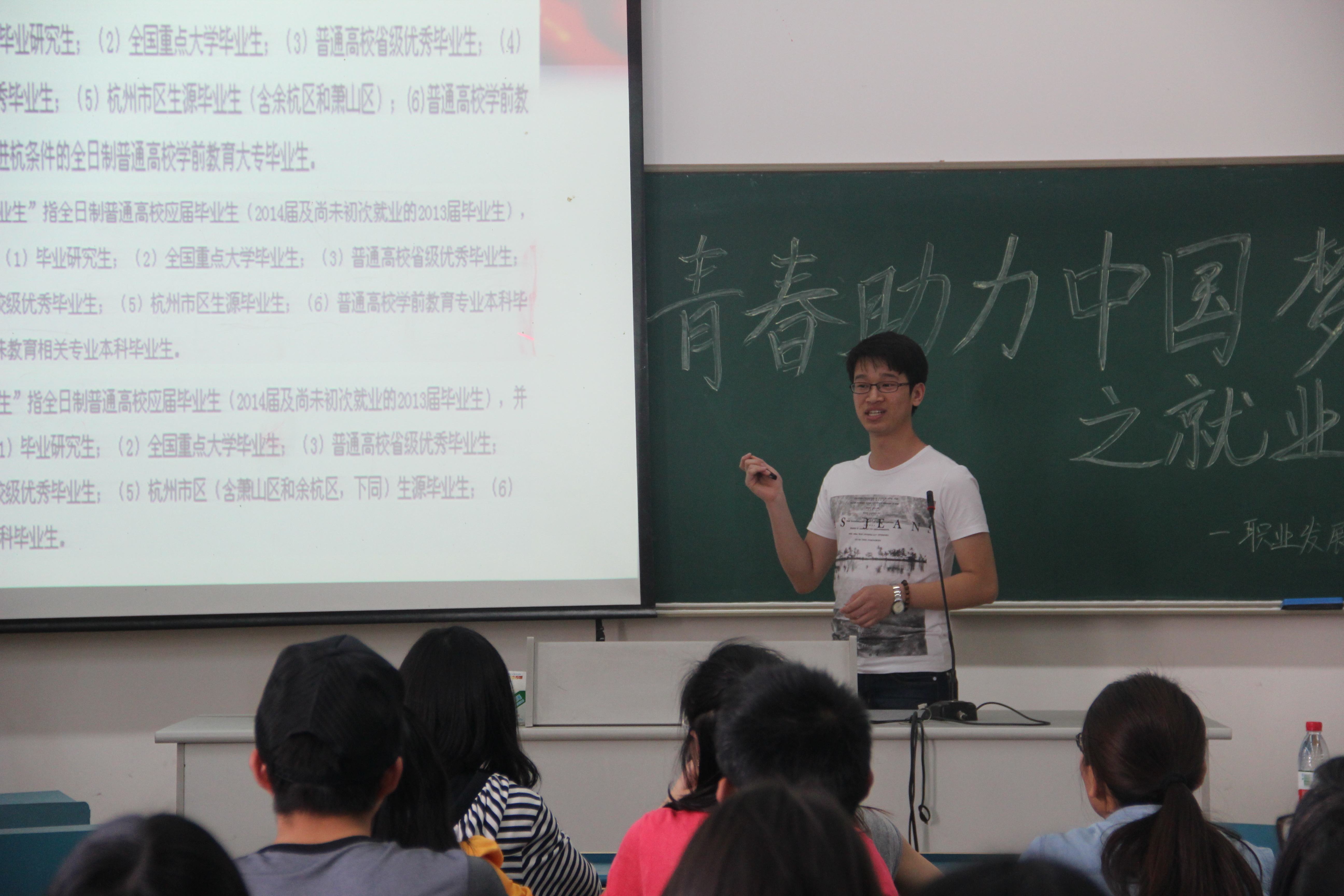 在主持人杨安乐致开场白之后,富慧学长用风趣的谈吐讲述了自己应聘浙江省富阳中学的经历,在座的观众都听得格外入神。随后汤明麟学长也起身风趣幽默地分析了当前社会的就业形势以及选择工作时的注意事项,同时讲了一些自己找工作就业的一些经历。汤学长偶尔的吐槽和玩笑,让整个现场一片欢笑。讲座最后,观众积极提问,咨询就业信息和就业经验,学长们都热情地一一回答。
