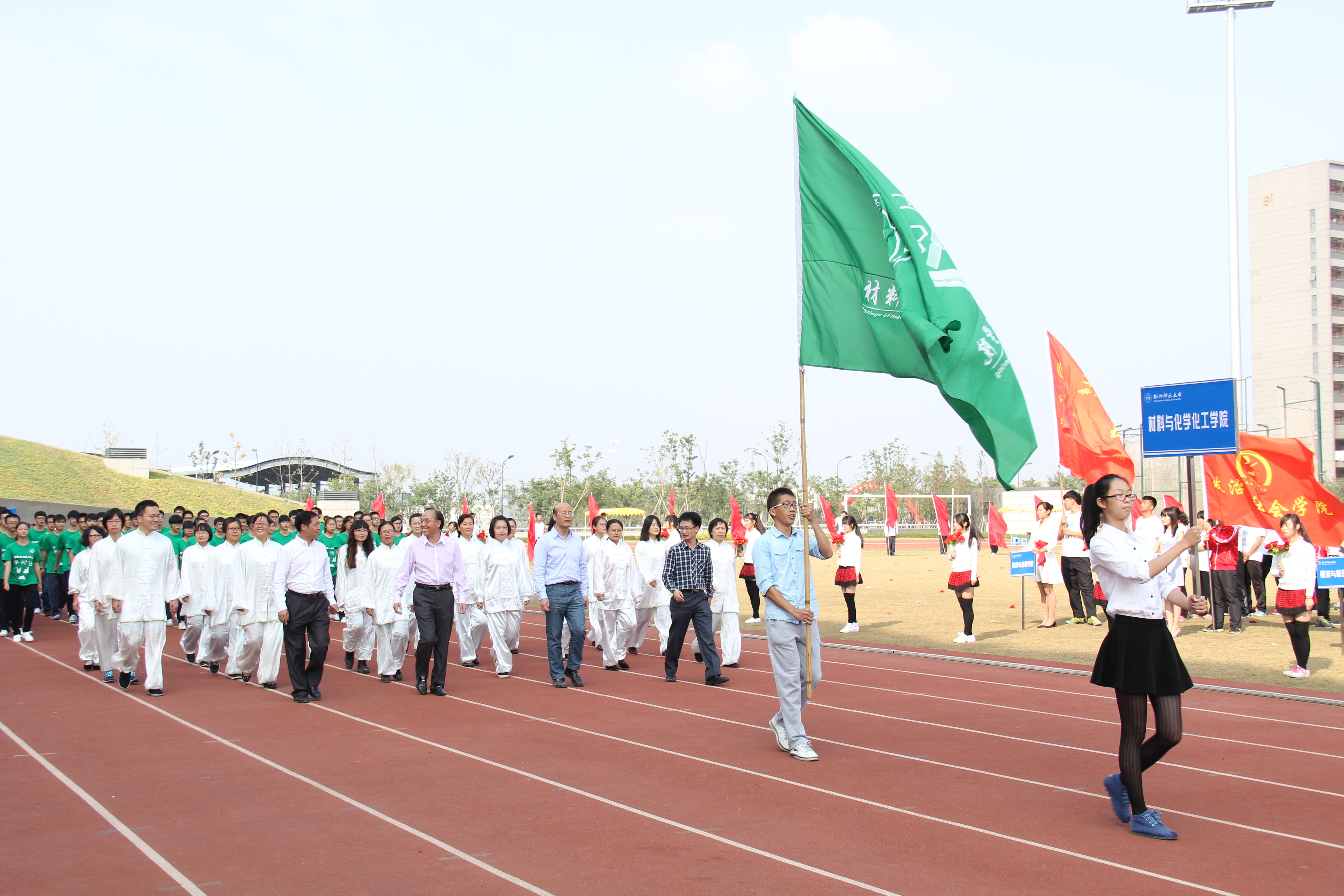 师生方阵精彩亮相。他们各个朝气蓬勃,精神抖擞,凭借具有学院特色的苯环队形打出精彩绝伦的一套特色拳。“材化学子,争创一流,团结奋进,共创辉煌”,声声遒劲有力的口号,激荡在会场上空,展现着jdb电子