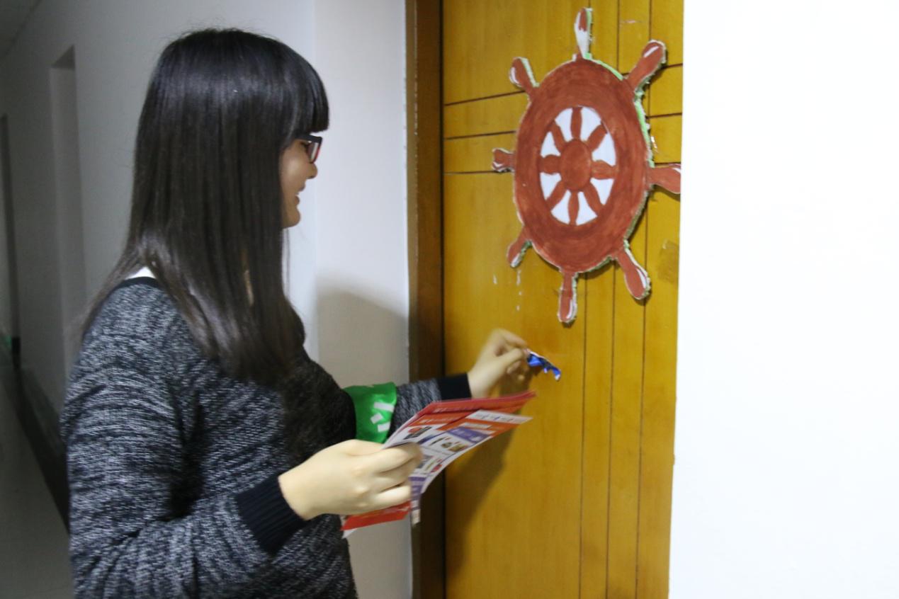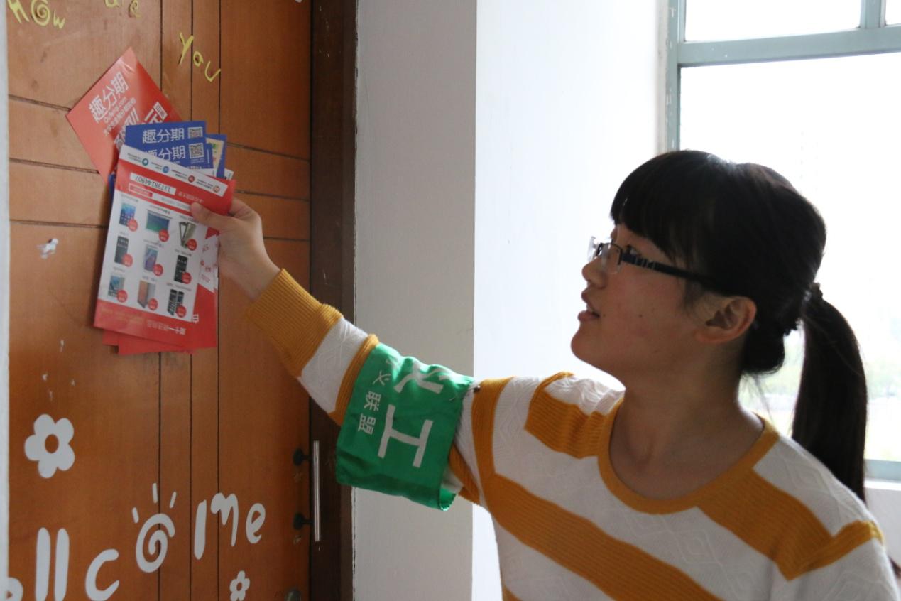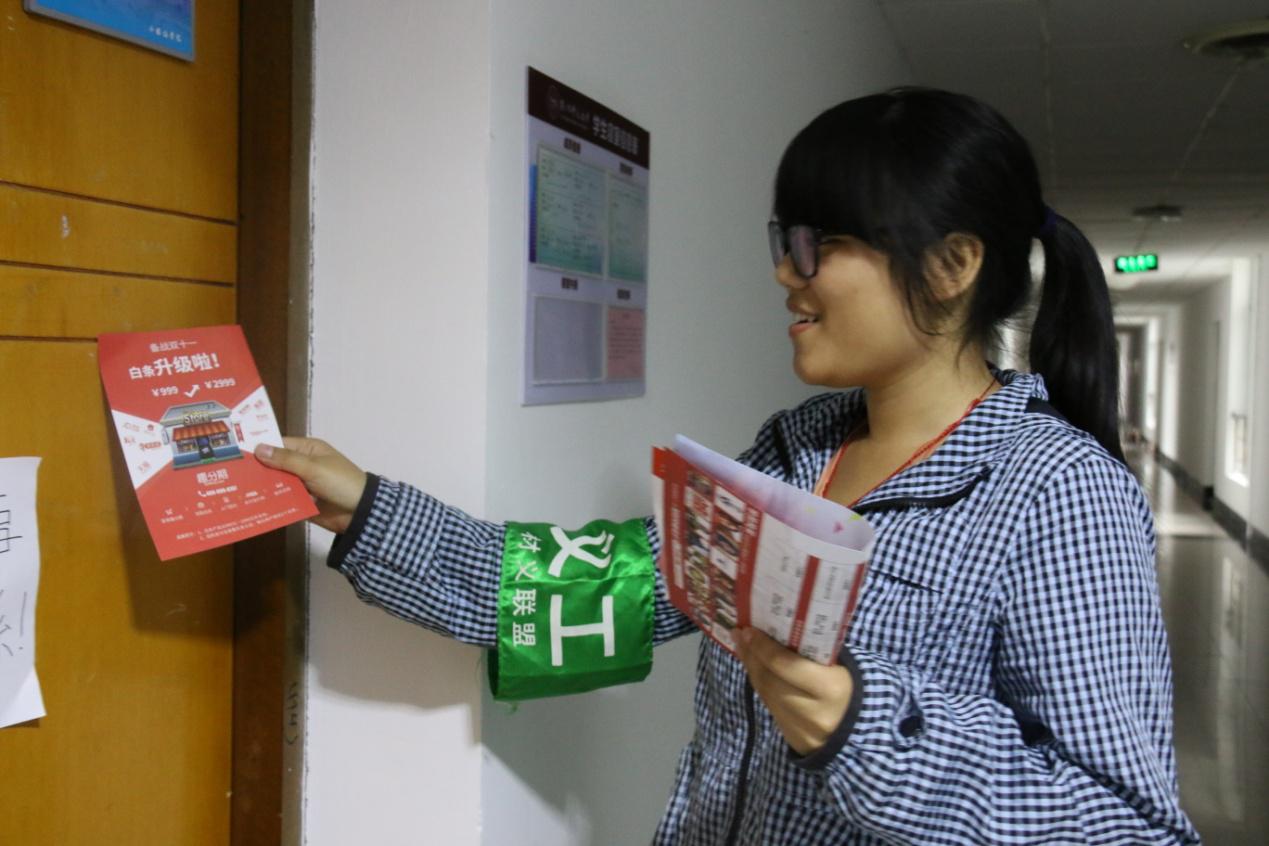 义工联盟在寝室楼展开寝室传单活动。jdb电子