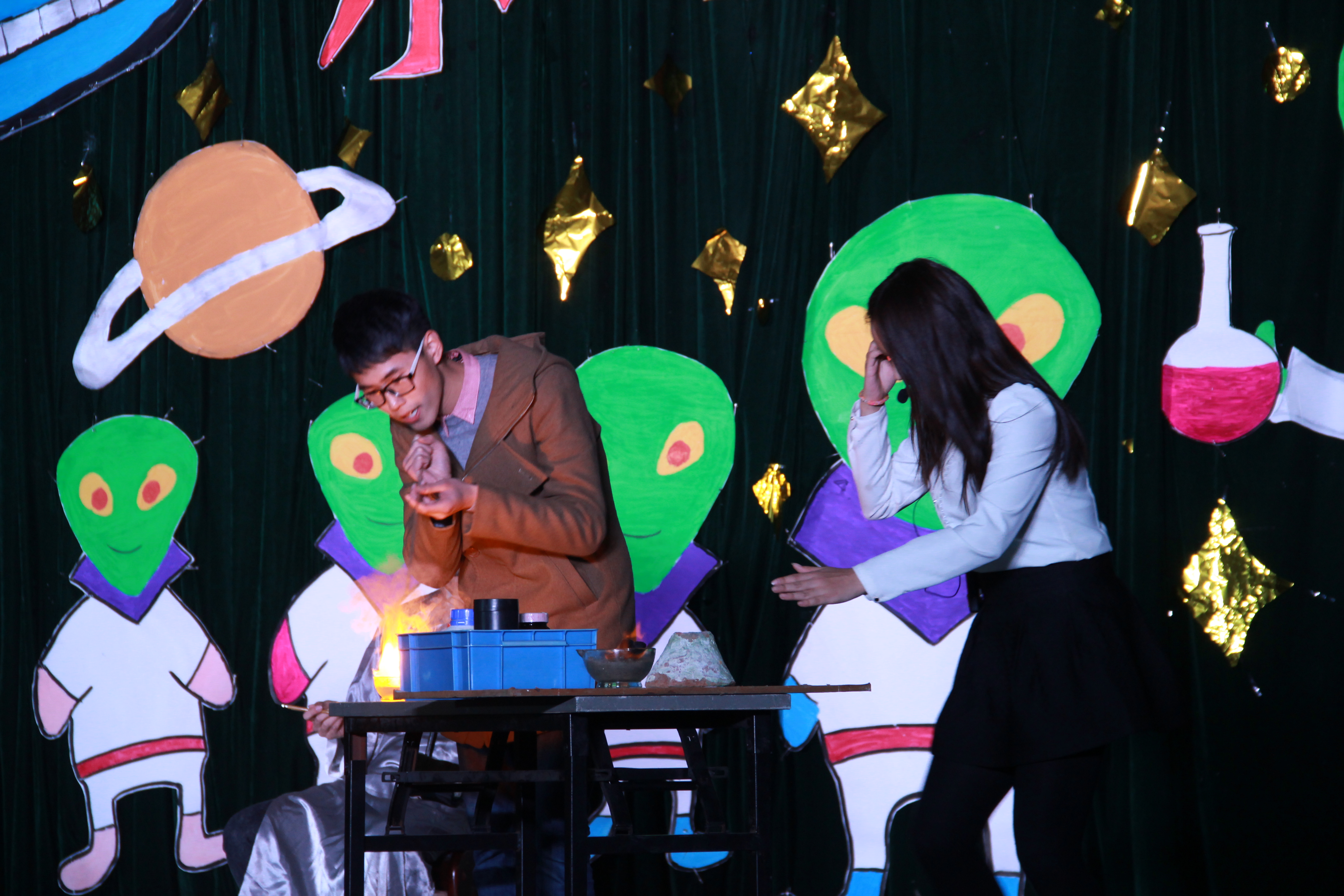 在随后的“耀你好看”环节中,每组都竭尽全力地将精心准备的情景剧展现在舞台上。他们将各种简单操作的化学实验穿插其中,为故事渲染氛围,也凸显了整个赛事“化学学术和趣味”的主题。其中,“水帘洞”小组带来的《白雪公主》给人耳目一新之感。成员们巧借经典的童话故事,并在其中切合地插进了“焰色反应”,瓶中的火焰,犹如听命的仆人,选手投放不同的试剂,它便呈现出不同的效果,时而出现点点的闪闪的星星,时而变成不同颜色的火舌,各种颜色的火焰巧妙流露“皇后”的恶毒,看得观众拍手称绝。而由“凯美斯特人”小组所带来的这个完整的爱情故事中,他们精巧地利用“红磷燃烧”为场景的展现做了和谐的渲染,还用浓硫酸使蔗糖脱水膨胀来制作故事中的道具,巧妙的构思赢得了台下的一致赞赏。每一个参赛小组饶有情趣的情景剧、引人赞叹的化学反应将现场的气氛渲染得无比火热。