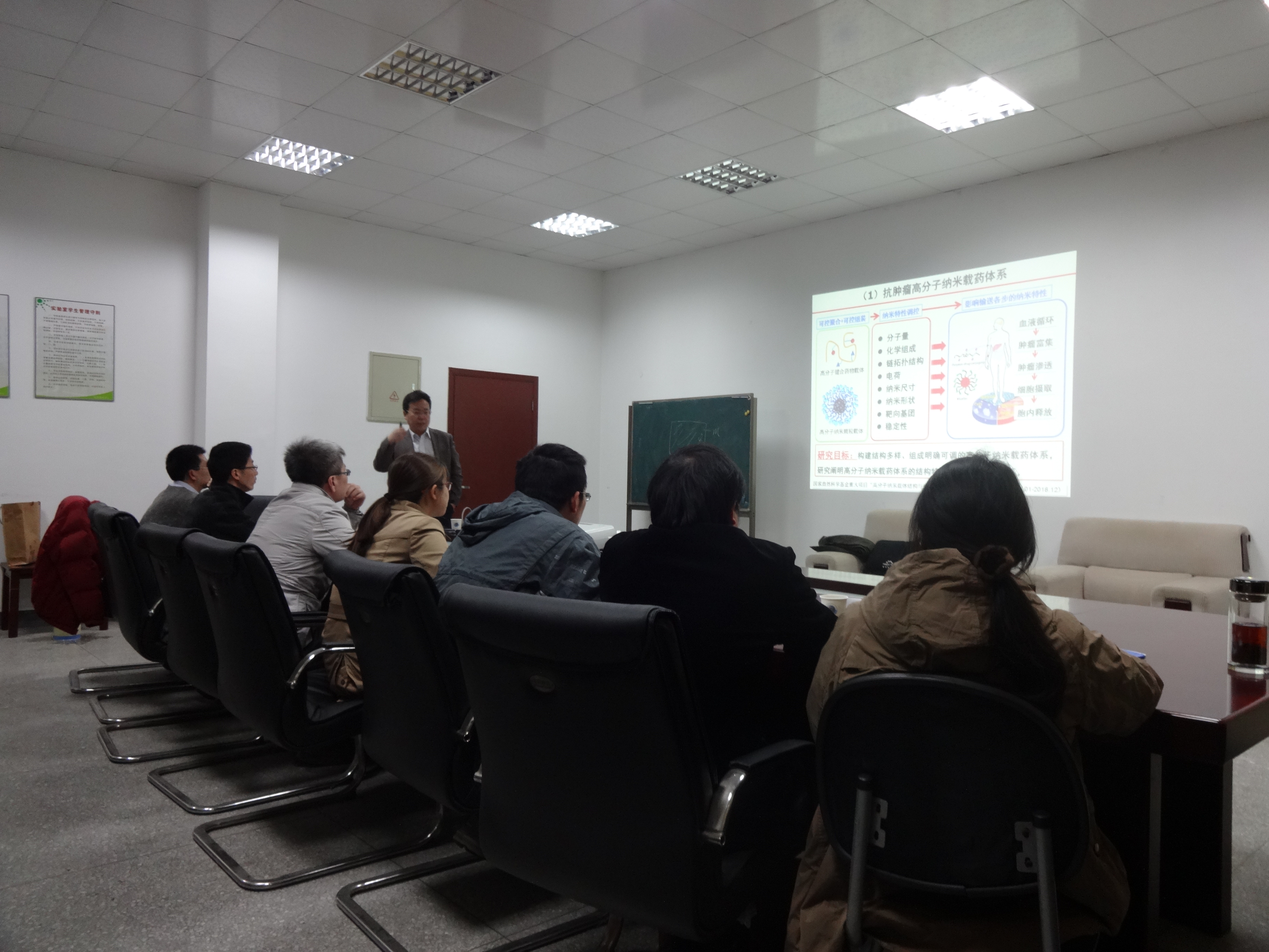 在李勇进教授对甘志华教授作了简单介绍后,报告在师生们热烈的掌声中拉开帷幕。甘志华教授简单介绍了自己课题组的研究方向,进而直接进入本次报告的主题。首先,甘志华教授介绍了抗肿瘤高分子纳米载药体系,通过增长载药高分子的循环时间来保证药物有足够的时间到达肿瘤部位;通过研究调节最佳生物分布和药物可控释放以提高治疗效果,降低毒副作用;其次,甘志华教授还介绍了在高分子表面引入活性分子对高分子基质的表面性质调控的影响,共聚物在体内的生物降解及共聚物与肝细胞在体内的相互作用;最后,甘志华教授介绍了高分子基质表面功能化:促进细胞生长。表界面性质促进细胞黏附,增殖与扩增。甘志华教授的讲座运用简单易懂的医学人体结构图,精美的PPT及丰富的人生经历对本次报告进行详细的解读,赢得了大家阵阵掌声。