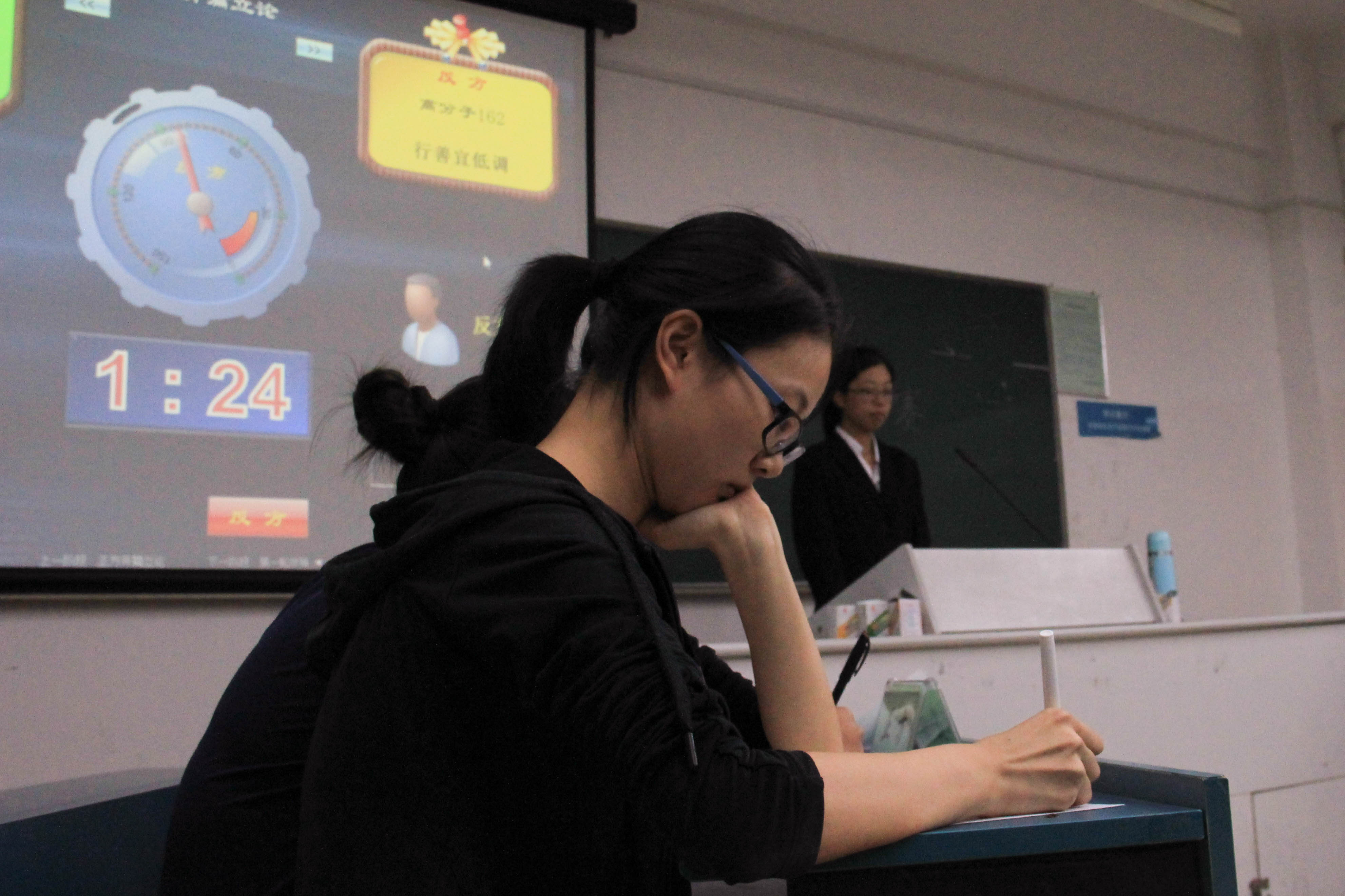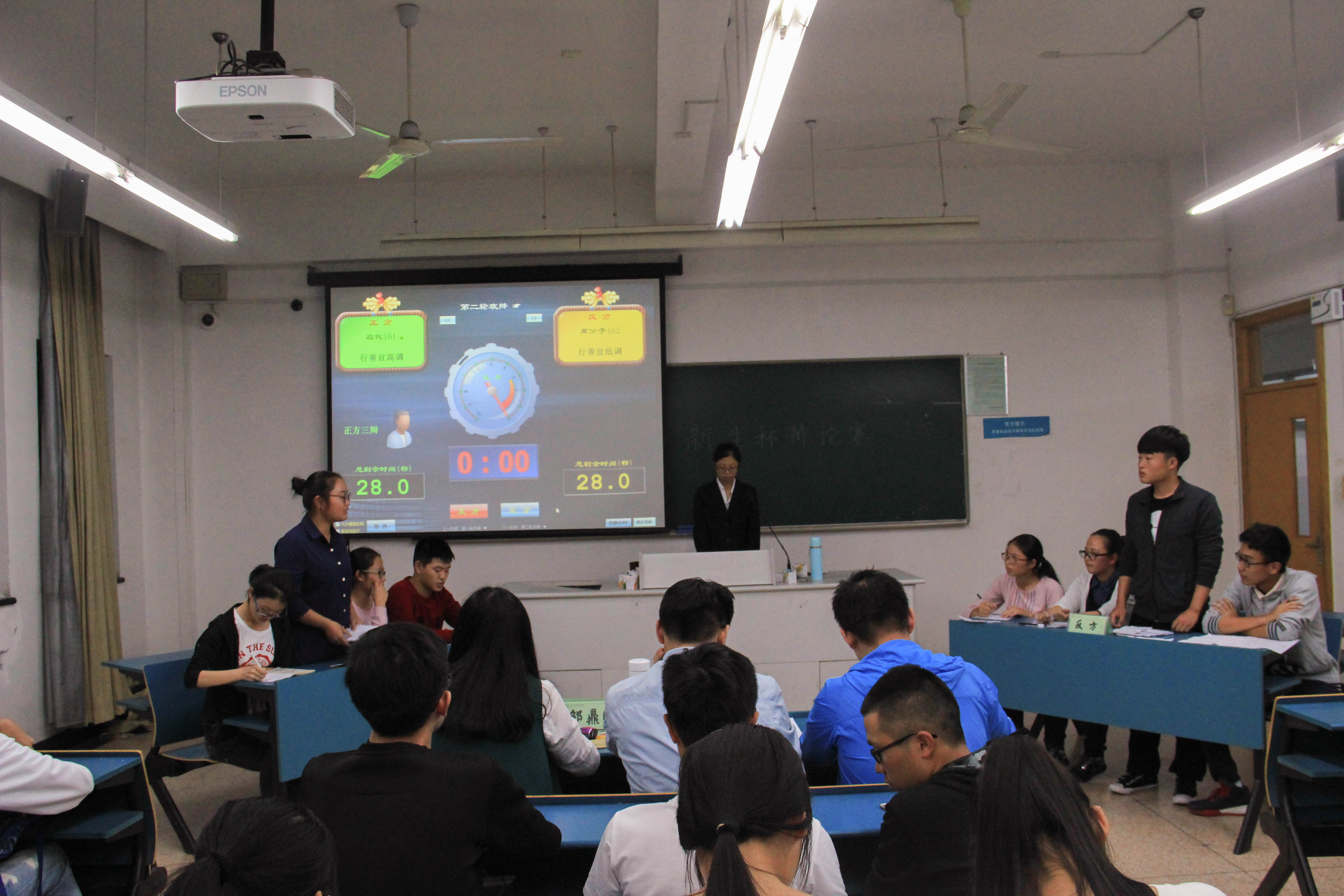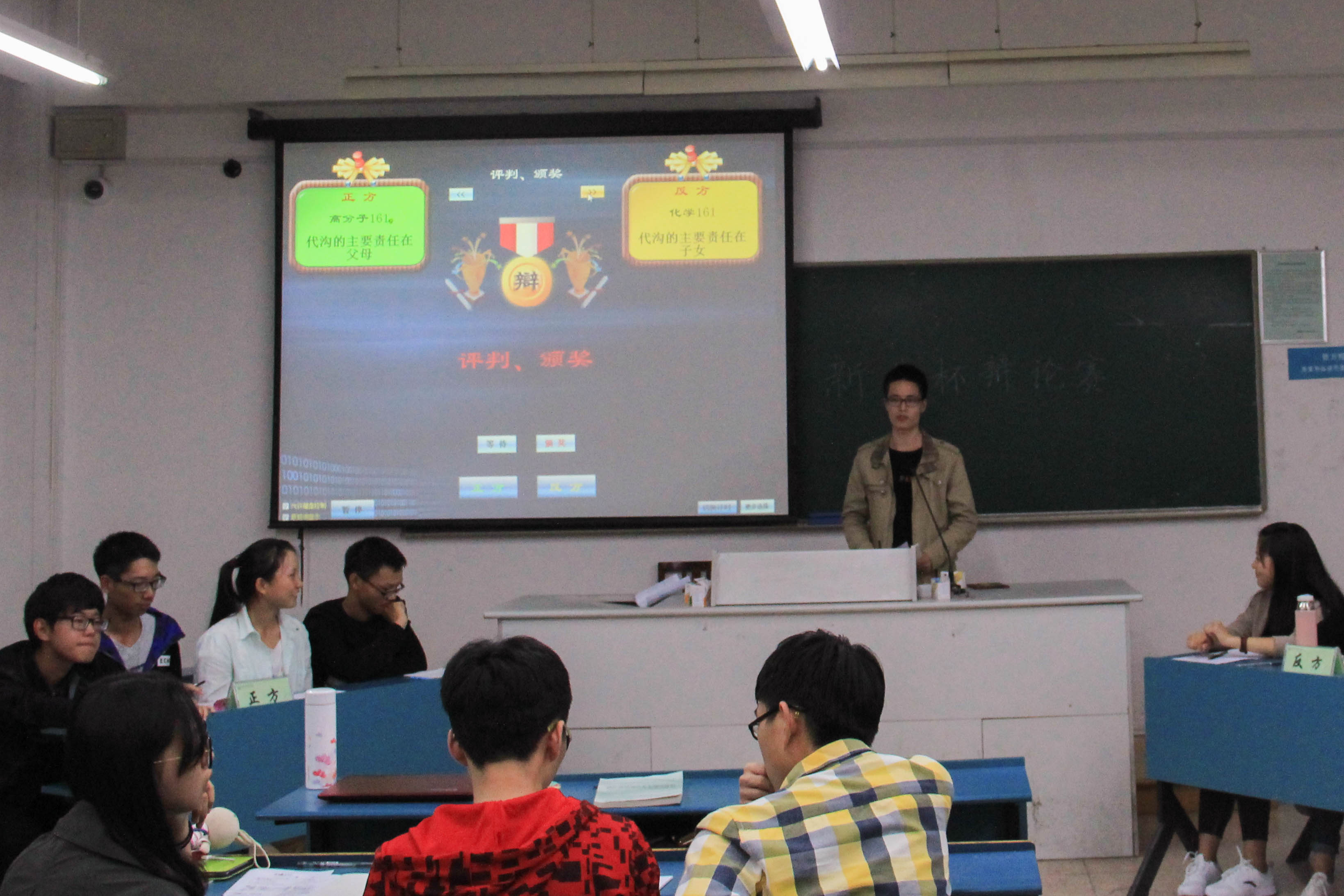 初赛分两场进行。首场参赛选手分别是来自应化161的正方选手与高分子162的反方选手。他们围绕着“行善是否应该高调”的论题展开了激烈的辩论。从高调行善的陈光标、被逼捐款的马云,到公交车让座的行为,辩论双方以清晰的逻辑思维与合理的驳斥赢得在场观众的热烈掌声。最终,首场辩论以正方获胜告终,反方一辩陈静晓同学则成为本次最佳辩手。第二场比赛正、反方分别是来自高分子161与化师161的选手。他们围绕着“代沟的主要责任是在家长还是在孩子”这个问题进行深入的探讨。选手以清晰流利的表达阐述自方观点。比赛中后期的自由辩论激烈,正方辩手引用各种事例向反方提问。来自化师的四位女生严谨认真的回答使在座观众称赞。现场气氛今人紧张而又激动。第二场比赛以反方的取胜告终,而此次的正方二辩也获得了最佳辩手的荣誉奖项。辩论结束后,学长学姐对赛程中出现的问题进行批判与点评。深刻的见解使参赛选手获益匪浅。本次新生杯辩论赛初赛在同学们的一片掌声中圆满落幕。