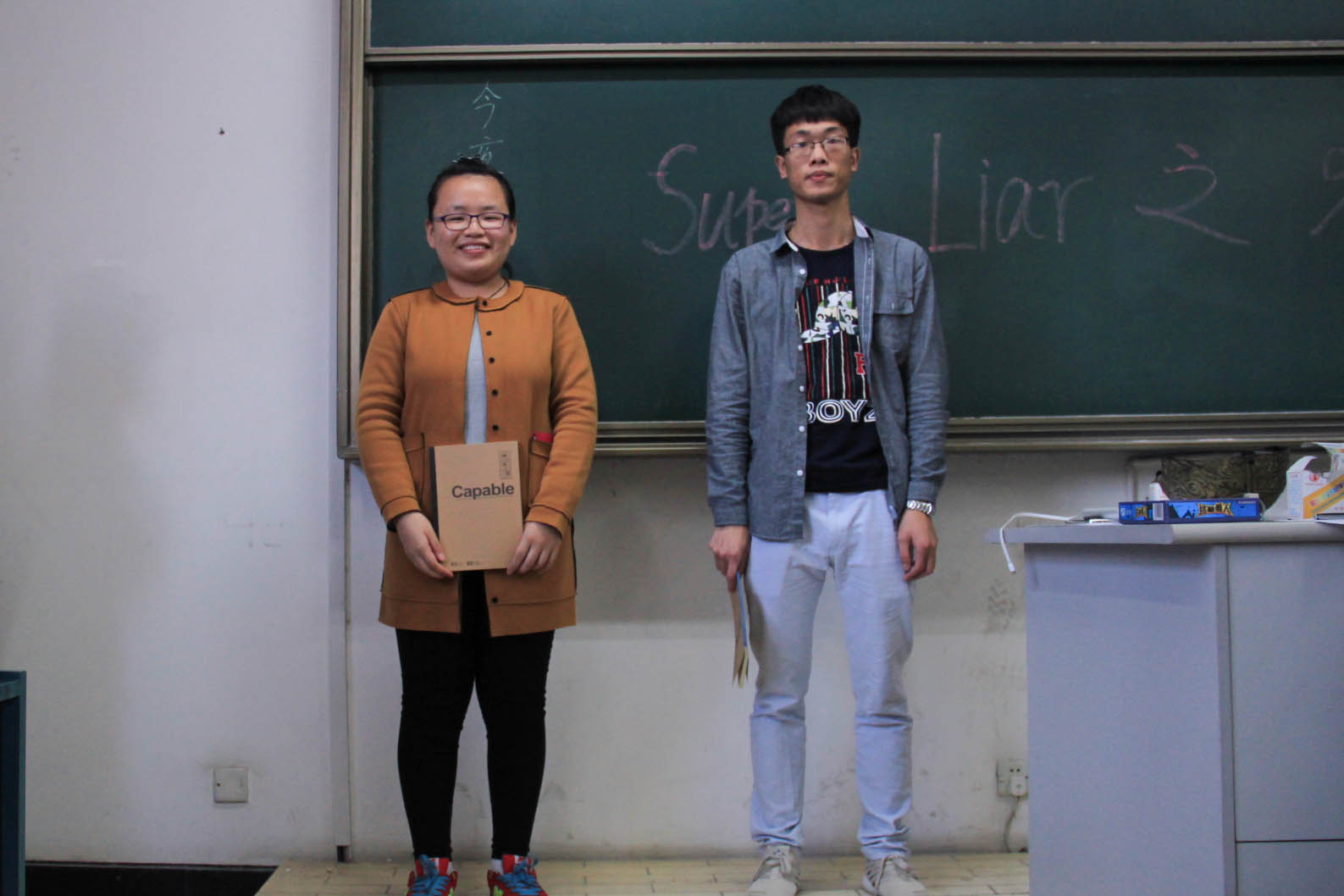三轮精彩的比赛之后,终于决出6位优胜者。曾锦树积分最高,获得了“狼王”称号,并且获得欢乐坊桌游一份,葛剑笋、罗馨楠同分,各获得了亚军称号、奖品水杯一个,朱志祥、刘洋和张炜昕则为季军,分别获得了笔记本一本。(文/刘磊)