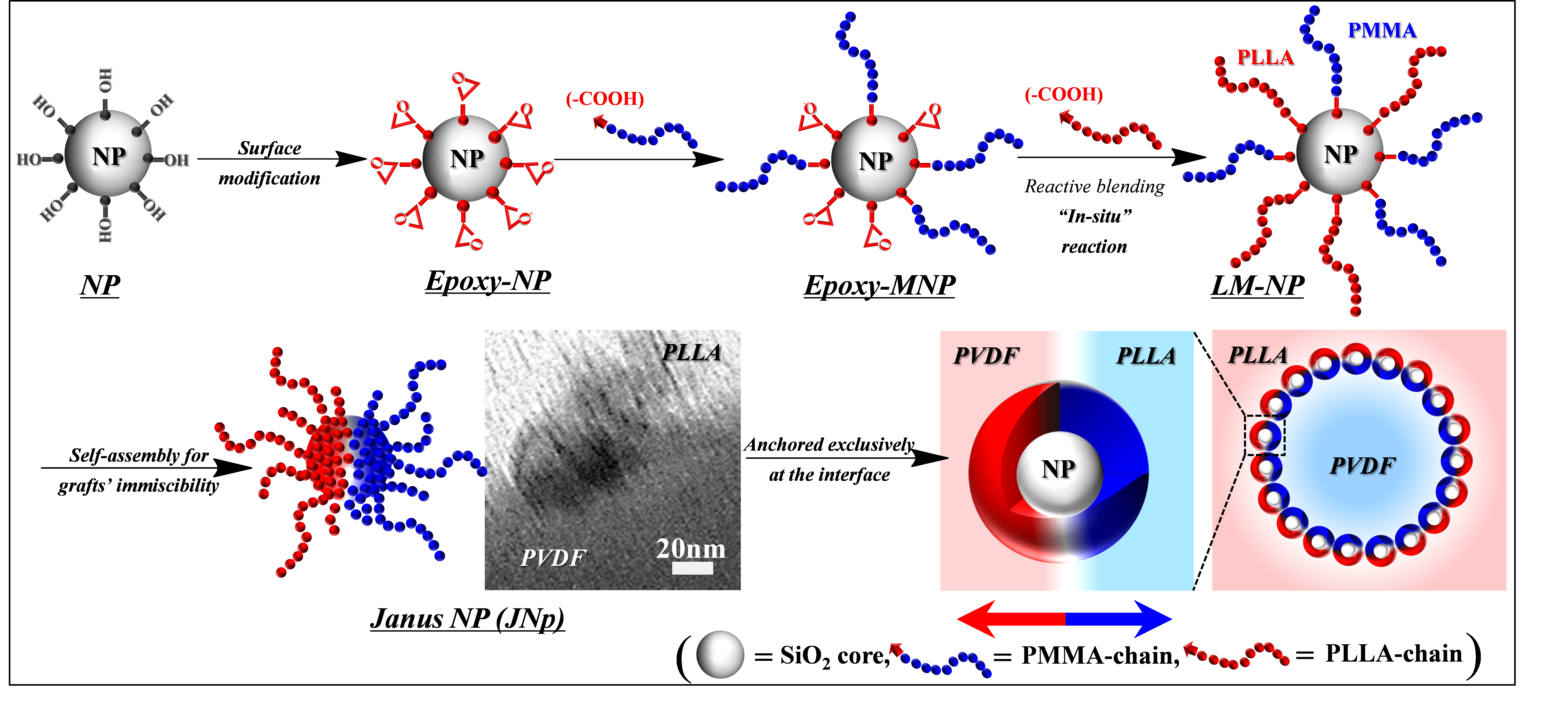 图1. 反应性纳米粒子对不相容体系的增容及Janus界面纳米粒子形成示意图