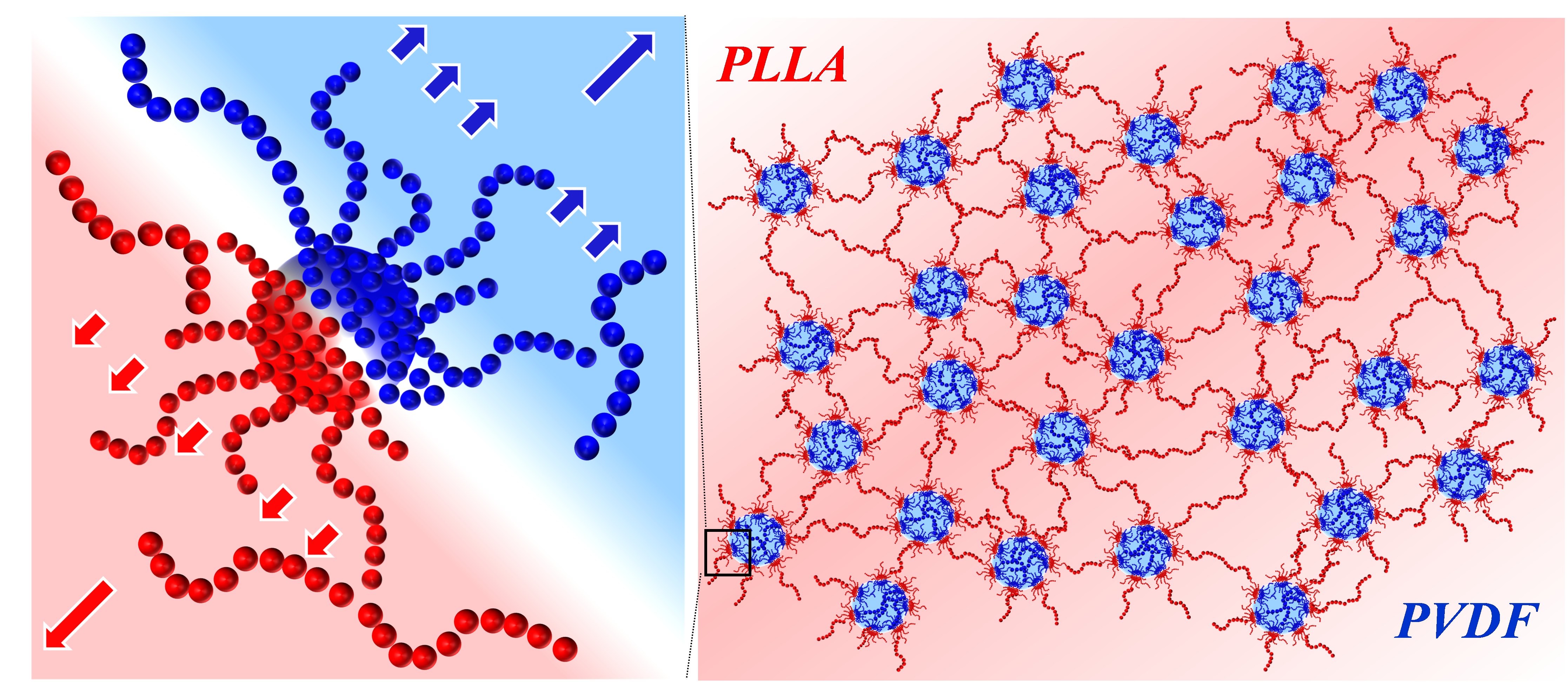 图2.“界面纳米粒子”增容不相容聚偏氟乙烯(PVDF)/聚乳酸(PLLA)的微观形貌(I)及其流变响应测试(II).