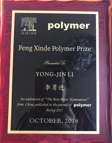 本次奖项由POLYMER期刊亚洲区资深编辑、主编及POLYMER期刊华裔编委组成评审委员会,经过公正严格的评阅,最终从全年235篇论文中评出本年度“冯新德高分子奖”最佳文章奖1篇,最佳文章提名奖8篇。李勇进教授获得最佳文章提名奖。