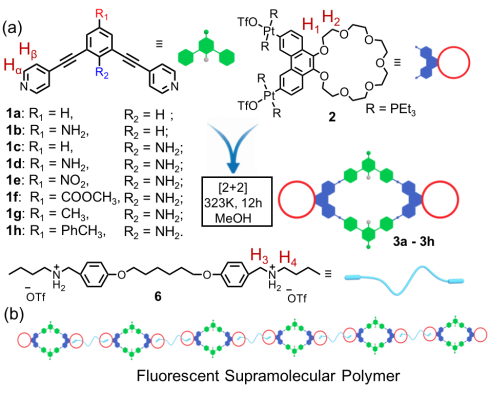 近期,jdb电子 尹守春教授在《美国化学会志》(Journal of the American Chemical Society, IF = 14.357,化学综合性国际顶级期刊)发表了一篇题为“Metallacycle-Cored Supramolecular Polymers: Fluorescence Tuning by Variation of Substituents” 的高水平学术论文(//pubs.acs.org/doi/10.1021/jacs.8b10842)。该论文报道了通过改变金属大环中吡啶配体的官能团,可实现对超分子聚合物发光性能的调控。这是尹守春教授在荧光超分子聚合物领域取得的最新研究成果。jdb电子 2015级硕士研究生徐洛楠为论文第一作者。