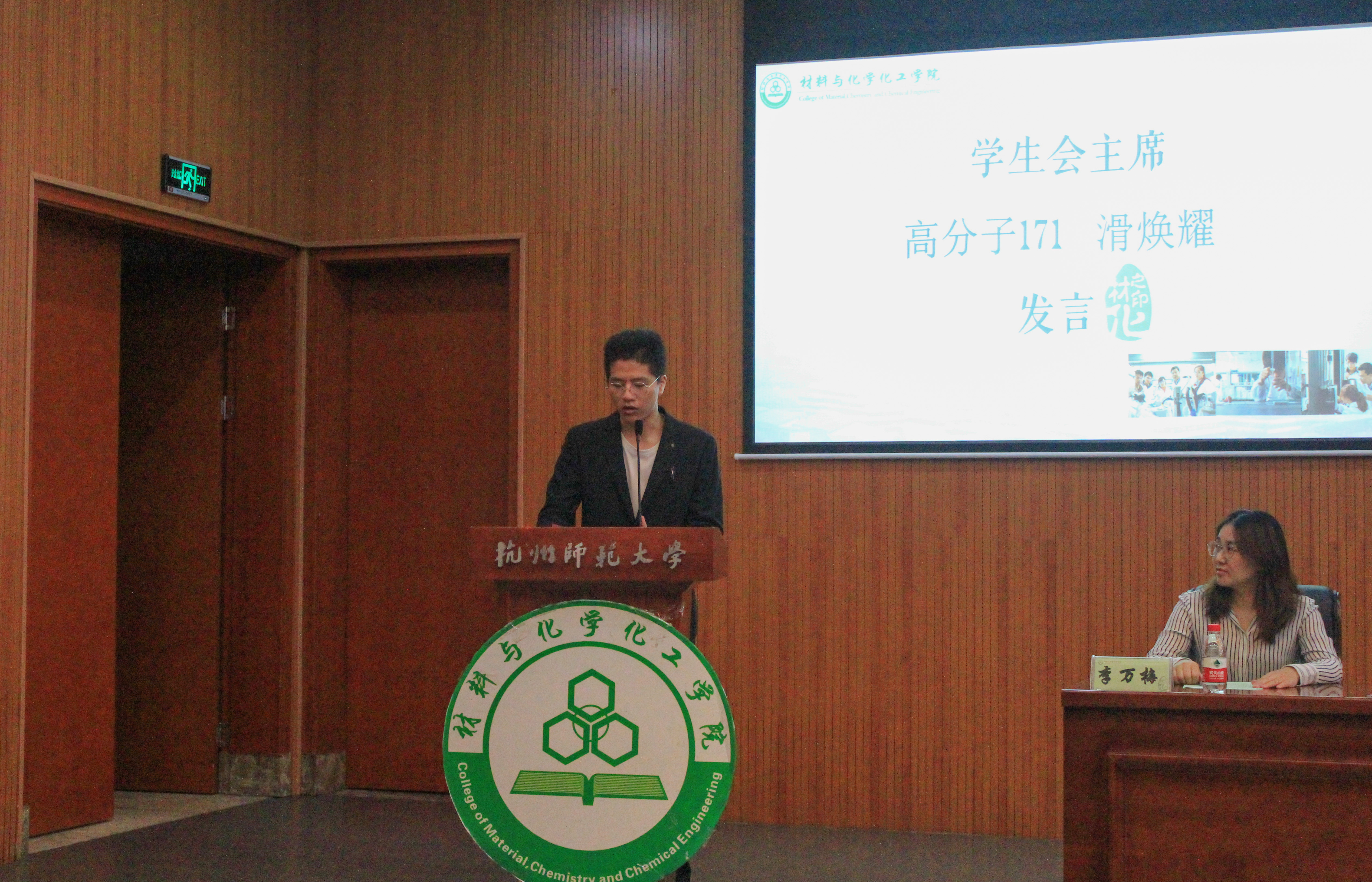 开学典礼由2019级新生辅导员韩秉峻主持。下午13:30分,典礼在庄严的国歌声中拉开序幕。学院学生会主席、高分子材料与工程171班的滑焕耀,化学类195班方静作为新老生代表先后上台发言。滑焕耀和新生们分享了自己在学院学习、科研等方面的经历,并鼓励学弟学妹们要专于学习、勤于学习、善于学习。方静则代表全体新生表达了进入新校园、翻开人生新篇章的激动心情,表示要学有所成、学有所获,以回馈社会。