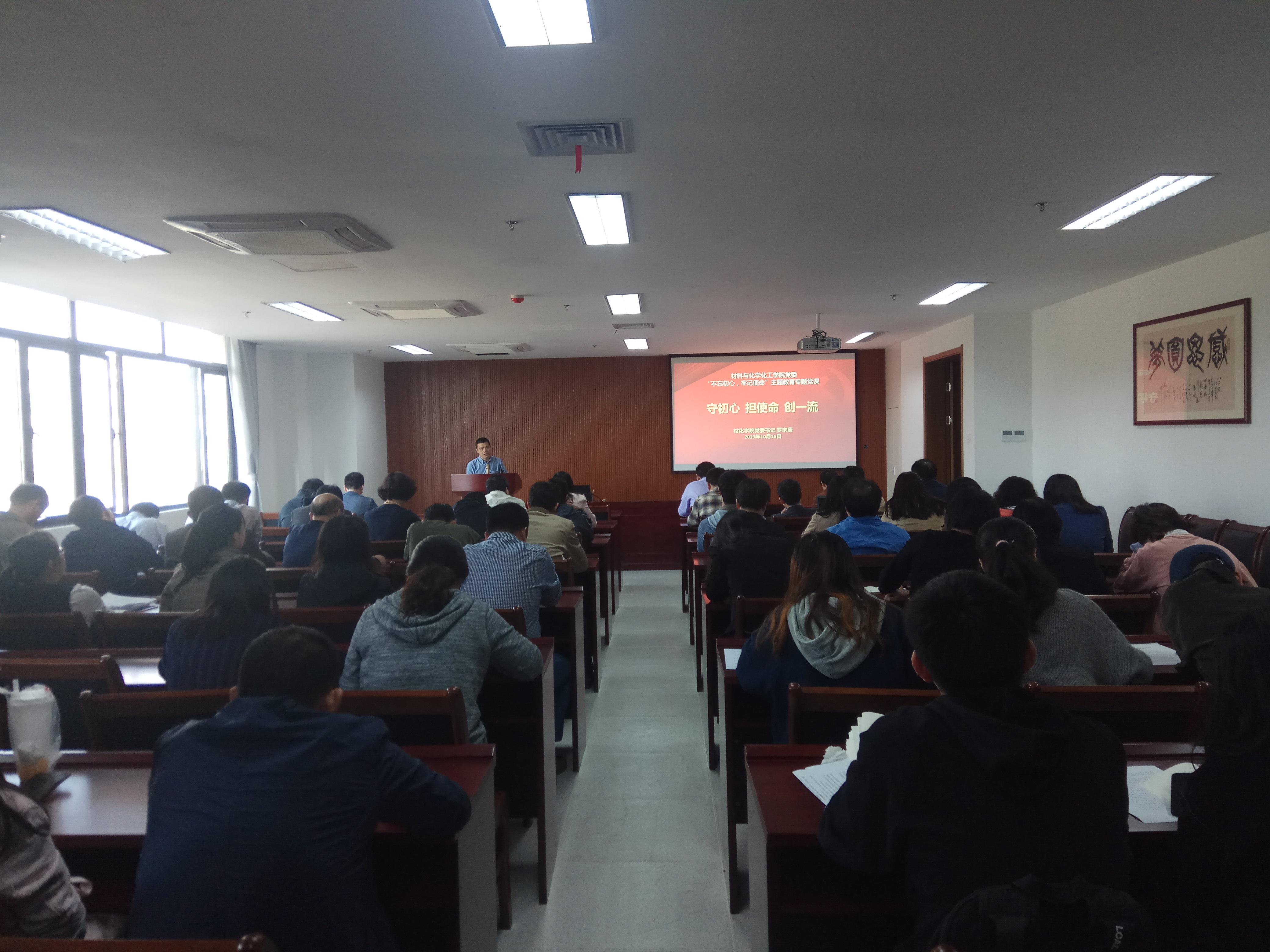 院长章鹏飞专题党课主题为“不忘初心,牢记使命,扎实推进一流学科专业建设”。他深刻阐述了开展“不忘初心、牢记使命”主题教育的意义,学院要结合实际,狠抓落实。学院全体师生,特别是教师党员、学生党员,应明确初心是什么,使命是什么。以“守初心”端正敬业态度,以“担使命”强化责任意识,以“找差距”促进教学相长,以“抓落实”保障教育成效。共产党员要勇于担当,做好榜样。全体同志要立足岗位,提升水平技能。学院要进一步改进管理模式,优化学科体系的结构布局,完善人才培养方案,加强国际国内合作交流。