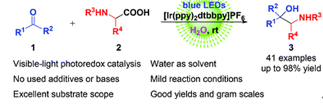1,2-氨基醇作为一种重要结构骨架,广泛存在于药物、天然产物、生物活性分子和有机配体中。传统的制备方法通常需要强还原剂和有机溶剂,甚至有毒的金属催化剂的加入,存在反应条件要求高,反应效率低等缺点。可见光催化反应可通过吸收利用可见波段光的能量,与底物发生能量转移或者电子转移过程,进而选择性地生成激发态自由基,从而高效率地构建化学键。基于此,钟国富团队设计了一种可见光氧化还原催化脱羧偶联策略,利用氨基酸衍生物和羰基化合物作为烷基自由基前体,成功实现了1,2-氨基醇类化合物的绿色合成。