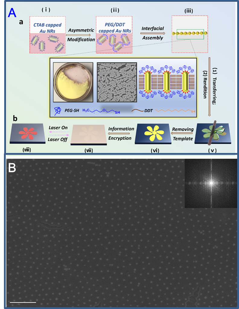 最近,黄又举教授团队通过精准调控纳米金棒表面的不对称修饰,利用金棒局部高分子间的相互作用,实现了液-液界面金棒的定向宏观组装。与传统组装不同的是,该体系不仅可以实现宏观大面积的均一组装(40 cm2),也可以通过粒子间的相互作用诱导金棒的肩并肩取向(图3A;Advanced Optical Materials 2020, 1902082)。肩并肩组装体相对于其它组装体可以更完美匹配808 nm激光光源,实现优异的光热转换性能,用于光热防伪器件。同时通过在纳米金粒子表面接枝聚苯胺(PANI)软配体,形成核壳结构。通过调节壳层厚度可实现纳米金粒子二维长程有序超晶格排列,借助PANI的多重刺激响应性可实现纳米金粒子单层膜的可逆等离子体激元调谐(图3B;ACS Appl. Mater. Interfaces 2020, 12 (9) 11296)。