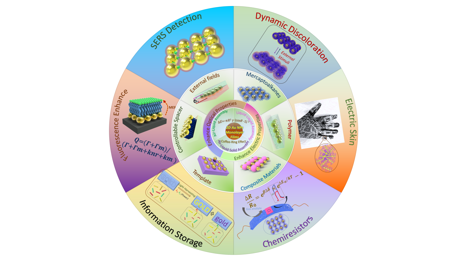 黄又举教授团队利用上述方法构建了一系列纳米金粒子单层膜,并成功应用于纳米生物传感器(Biosensors and Bioelectronics 2020, 112277;Biosensors and Bioelectronics 2019, 143, 111616;Biosensors & Bioelectronics 2018, 118, 247;Analytical Chemistry 2019, 91 (23), 14792;Analytical Chemistry 2018, 90 (10), 6124)、食品快速检测(Food Chemistry 2020, 329, 127160)、光学防伪与显示(Advanced Materials Interfaces 2018, 1800026;Advanced Optical Materials 2020, 1902082),以及海水净化(Journal of Materials Chemistry A 2018, 6 (22), 10217)等领域。基于纳米金粒子二维自组装方法以及单层膜的相关应用方面的工作,团队以Macroscopic two-dimensional monolayer films of gold nanoparticles: fabrication strategies, surface engineering and functional applications为题撰写综述,发表在英国皇家化学会纳米尺度上(Nanoscale 2020, 12 (14), 7433)。
