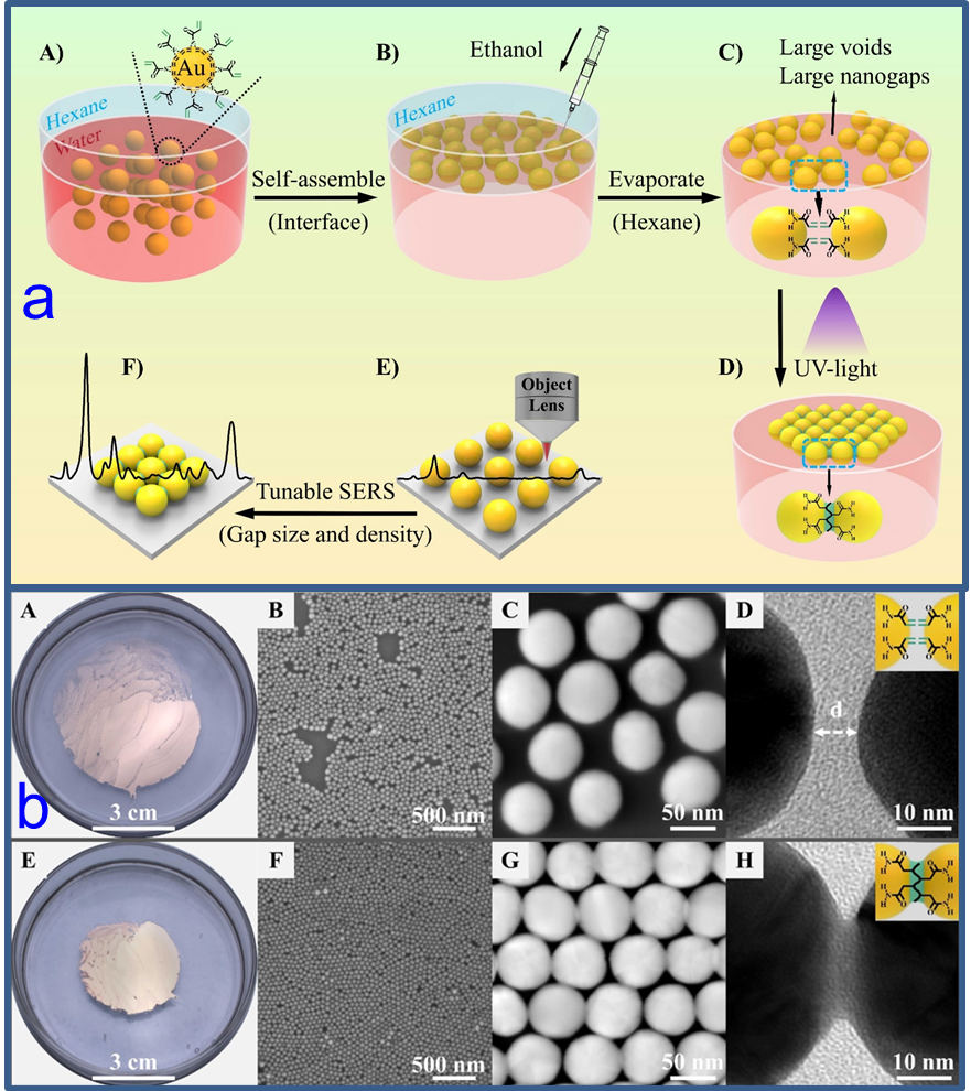 图1纳米金粒子表面交联诱导的液液界面自组装方法(a);传统方法(b:A-D)与本方法(b:E-H)获取纳米金粒子单层膜粒子间距调控的对比。