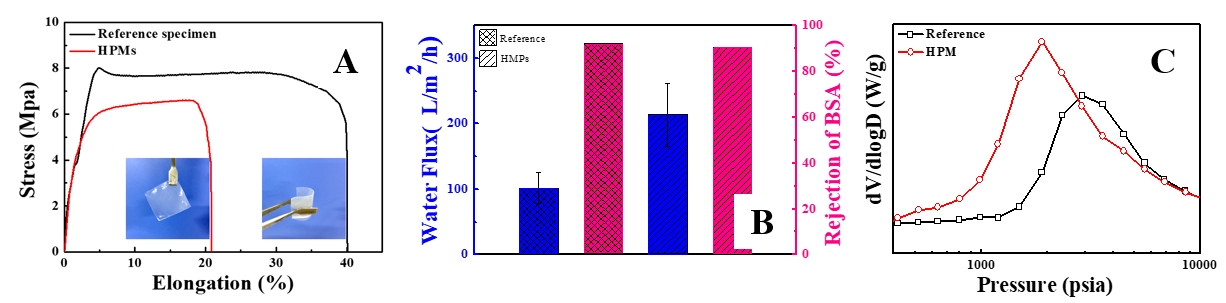 图3 单级孔薄膜与“海岛”多级孔薄膜的力学性能(A)、分离性能(B-C)
