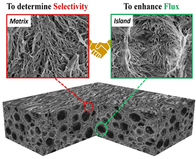 多孔材料在分离领域具有广泛的应用,通量和截留率是评价其分离性能的两个重要参数。一般来说,增大孔径可以提高分离通量,同时导致截留率的降低;相反,更小的孔径对应高截留率和低通量。这就是膜分离领域众所周知的“Trade-off”效应。为克服上述效应,jdb电子 由吉春教授联合中科院长春应化所丁明明副研究员,提出了新的解决方案,即构建孤立微米圆形孔与连续狭长纳米孔相结合的多级孔结构。