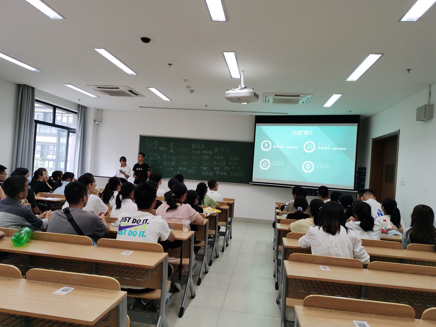 205班团支书通过幻灯片展示了如今“舌尖上的浪费”现状,并与大家一起列举了当今浪费粮食的几大形式,使得同学们对粮食浪费以及光盘行动有了更加清晰的认知。随后,团支书发起了以寝室为单位的光盘比赛,鼓励全班同学加入光盘族的行列。