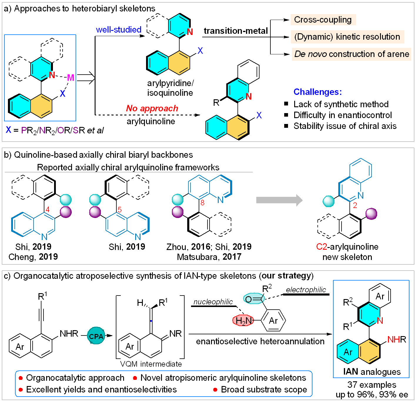 众所周知,2-芳基吡啶(异喹啉)类轴手性骨架是众多优势手性催化剂和配体的核心结构单元, 然而其高对映选择性构建却面临着许多挑战。例如,已见报道的合成方法主要依赖于过渡金属的参与,而基于有机催化的合成策略却尚未实现;其次,目前该类轴手性骨架中含氮芳杂环大多局限于吡啶、异喹啉结构,而对于含喹啉等其他杂环的类似轴手性骨架的报道却极少。因此,为了不断探索新型的潜在优势轴手性骨架,jdb电子 钟国富教授团队与南方科技大学的谭斌教授合作,设计了一类新型的2-芳基喹啉轴手性骨架,并首次提出通过有机催化策略,利用手性磷酸(CPA)催化下芳基炔烃类化合物与邻氨基氟代苯乙酮的不对称串联环化反应来实现目标IAN类轴手性骨架的不对称构建。该方法具有良好的底物适用性,在温和条件下以优秀的收率和对映选择性快速高效地合成了一系列新型2-芳基喹啉轴手性化合物。同时,通过克级放大实验以及一系列的衍生化反应,体现出该研究具有进行大规模制备以及在开发新型手性催化剂和配体方面广阔的应用前景。该工作是首例通过有机催化策略不对称合成IAN类轴手性化合物的报道,为相关轴手性骨架化合物的高效构建提供了一种全新策略。