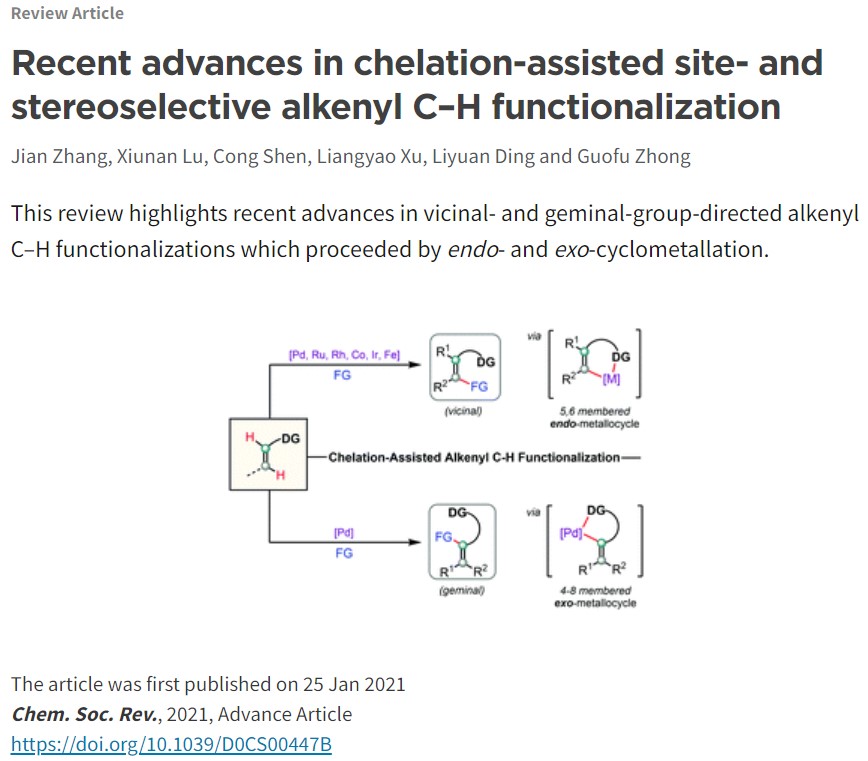 近日,jdb电子 jdb电子 的张坚教授与钟国富教授,凭借课题组近五年来在配位导向下烯烃惰性碳氢键的选择性活化/官能团化研究领域的出色工作,受邀总结了本课题组和国内外同行们在该领域中同碳位和邻碳位碳氢键官能团化反应,包括:烯基化、烯丙基化、烷基化、芳基化、卤化、以及多米诺环化等,并对各种方法的优缺点进行归纳和总结,最后对该领域的发展和应用进行展望。该成果近日以题为“Recent advances in chelation-assisted site- and stereoselective alkenyl C–H functionalization”,在英国皇家化学学会顶级综述期刊Chemical Society Reviews(IF: 42.846)上发表(Chem. Soc. Rev., 2021, DOI: org/10.1039/D0CS00447B, Advance Article)。张坚教授和钟国富教授为该文章的共同通讯作者。