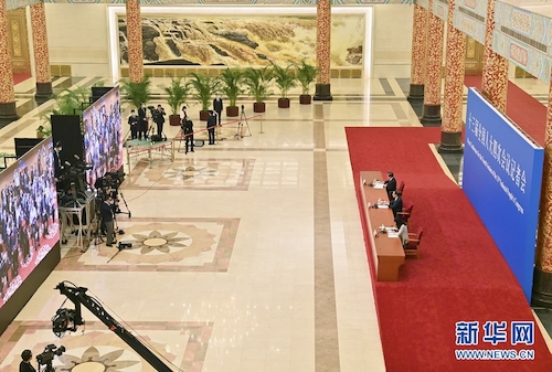 3月11日下午,十三届全国人大四次会议在北京人民大会堂举行记者会,国务院总理李克强应大会发言人张业遂的邀请出席记者会,并回答中外记者提问。这是记者在位于梅地亚中心的分会场采访。新华社记者 金立旺 摄