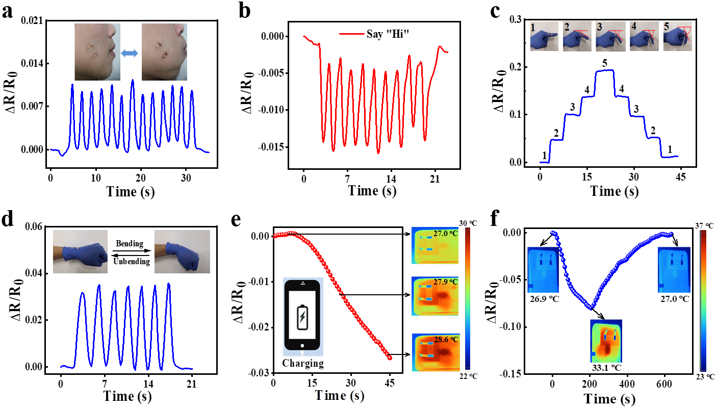 近期,朱雨田教授课题组选用离子液体(IL)作为导电组分,和热塑性聚氨酯(TPU)复合,得到具有应变和温度敏感特性的柔性、透明和抗菌的多功能离子凝胶型传感器(图1)。作为应变传感材料时,离子凝胶材料具有较宽的应变响应范围(0.1-500%)和快速的响应时间(96 ms)和回复时间(119 ms);在拉伸应变50%条件下经过1000次加载/卸载循环后,表现出优异的重复性和稳定性(图2)。作为温度传感材料时,离子凝胶的温度检测精度低至0.1 ºC,温度检测范围在-40-100 ºC,具有优异的抗冻性和耐高温性,并在拉伸状态下仍能保持优异的温度敏感行为(图3)。基于离子凝胶优异的应变和温度传感性能,一方面,该传感材料可用于监测人体微妙运动(例如,脸颊凸起和说话)和大幅度运动(例如,手指和手腕的弯曲);另一方面,还可以监测各种温度变化信号(例如,手机充电引起的温度变化)(图4)。同时,这种基于离子凝胶的传感材料具有明显的抗菌能力和良好的生物相容性。相关论文以“Flexible, Transparent, and Antibacterial Ionogels toward Highly Sensitive Strain and Temperature Sensors”为题,发表在《Chemical Engineering Journal》上。