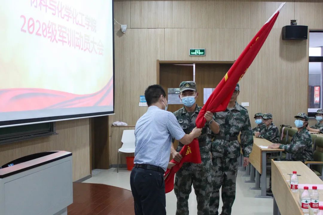 最后,在全体学员的注视下,管庆江副书记将鲜红的旗帜庄重地授予沈连长,军训由此拉开帷幕。
