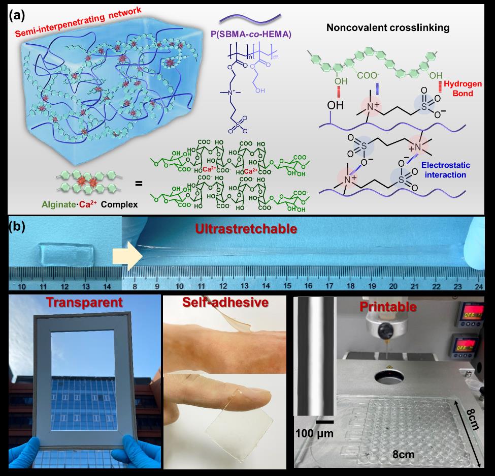 “离子皮肤”是一种基于离子电传导机制来模拟人类皮肤感知应力、温度等多重功能的柔性电子器件。这一新材料概念一经提出即引起了科学家们广泛的研究兴趣,发展出一系列基于弹性体和水凝胶的导电型柔性材料,在柔性电子学所涉及的穿戴式健康监测系统、人机交互界面、智能软机器人等多个领域,展现出诱人的商业化应用前景。当前离子皮肤材料的发展日新月异,它们分别在拉伸性、导电性、自愈合性、透明性、粘附性等关键性能方面,可以满足特定的应用需求。然而,当前材料大多注重单一性能的提高和优化,其综合性能表现与未来商业化离子皮肤的高要求相比,仍有不小的差距,也是目前制约该领域发展的瓶颈问题。针对离子皮肤对材料综合性能的需求,黄又举教授团队与中科院宁波材料所陈静课题组进行合作研究,通过精心设计水凝胶的组分、网络结构和链间相互作用,发展了一类集超拉伸、高透明、自粘附、可3D打印、生物相容等多功能于一身的离子导电水凝胶材料。该材料具备和人类皮肤相仿的离子电传导能力和应力/温度双重传感功能,在穿戴式健康监测、仿生机器人、多模态生理电信号同步采集等方面展现出重要的应用潜力。
