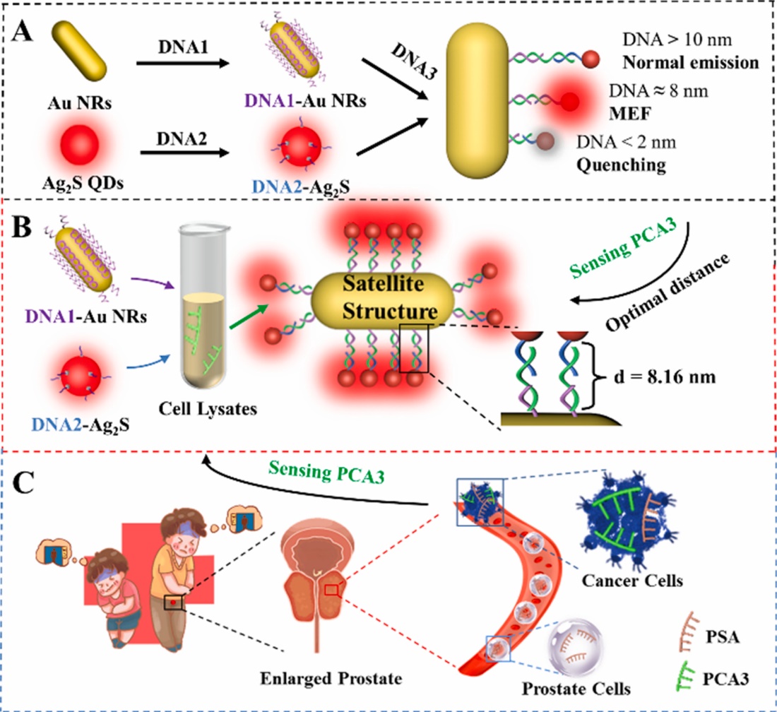 在此工作中,基于荧光分析法响应速度快,灵敏度高,无损和实时监测的优点,以及贵金属增强荧光可进一步提高荧光探针灵敏度的优势。在相关的背景调研和启发下,jdb电子 材料化学与化工学院的黄又举团队提出了,通过结合等离子体金纳米棒(Au NRs) 和近红外硫化银量子点(NIR Ag2S QDs),开发了PCA3的新型高灵敏和高选择性的生物传感检测平台。如图1所示,基于PCA3序列的长度恰好满足贵金属增强荧光的最佳距离,我们分别设计核酸序列DNA1和DNA2用于Au NRs的修饰和Ag2S QDs的合成,在目标物PCA3的存在下通过碱基互补配对原则形成荧光增强的卫星超结构,从而根据近红外荧光信号的变化实现PCA3的灵敏检测。同时,也通过使用不同链长的DNA作为间隔来控制Ag2S QDs和Au NRs之间的距离,进一步验证了Au NRs和Ag2S QDs之间最佳的荧光增强距离与PCA3序列长度是完美匹配的。并且,该探针可用于分析前列腺癌细胞PC-3和LNCap细胞裂解物中的PCA3。据我们所知,这是荧光增强的近红外Au NRs@Ag2S QDs超结构探针首次用于高灵敏检测PCA3,为将来检测其他生物标志物提供了新的策略。