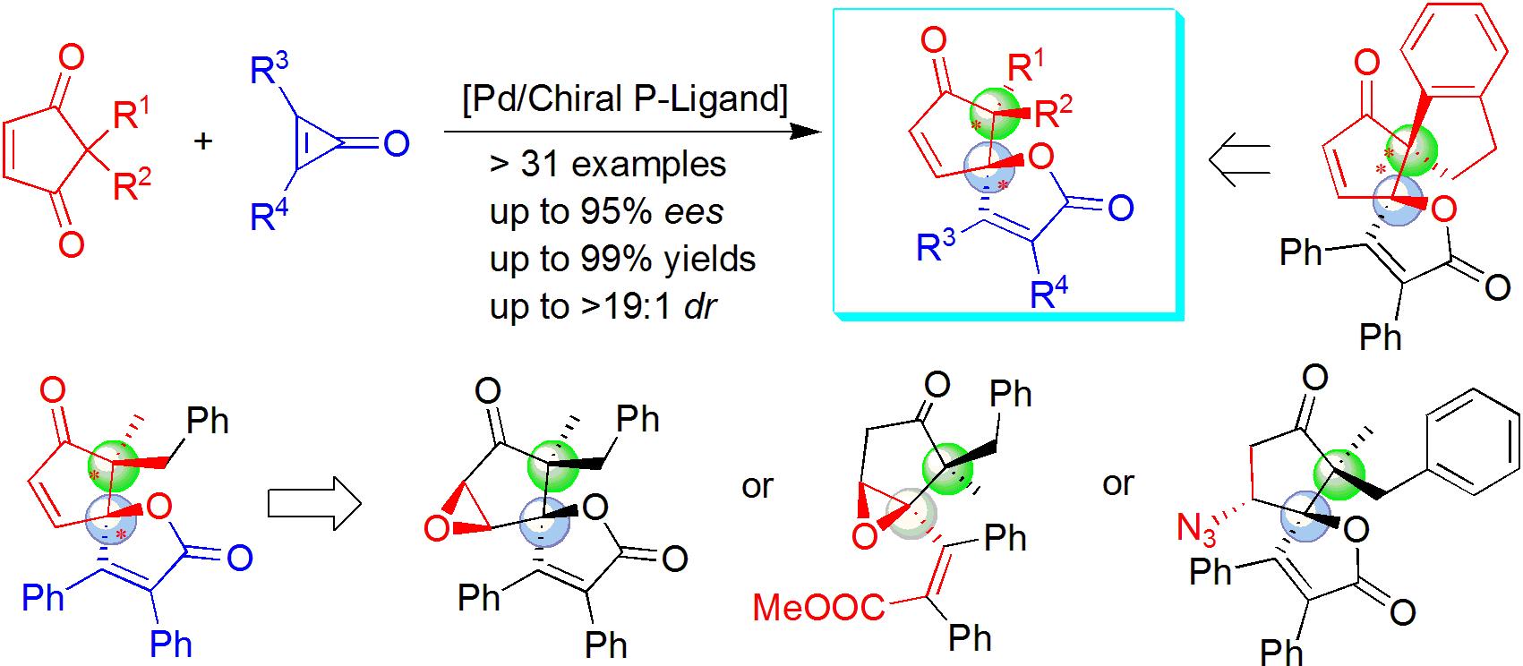 鉴于C-C键活化和手性配体在构建四取代立体手性中心上有着巨大的潜力,jdb电子 徐利文课题组在前期不对称催化化学的研究基础(见该团队近期研究专题报道,Acc. Chem. Res. 2021, 54, 452-470)上,利用钯金属和TADDOL衍生的大位阻膦配体,首次高效、高对映选择性、高非对映选择性催化环丙烯酮和环戊烯-1,3-二酮进行(3+2)螺环化反应。一方面利用环丙烯酮作为活性物质实现双官能化合物的去对称化,同时也提出了一个利用具有刚性的环状二酮底物进行环加成模式的C(sp2)-C(sp2)键活化和失对称化反应来构建两个相邻的碳四元手性中心的新策略,成功构建了带有两个相邻的碳四元立体手性中心的氧杂螺环化合物并适用于一系列小环底物以良好的产率,优异的非对映选择性和对映选择性合成了相应的具有环戊烯酮-内酯支架的高度官能化氧杂螺环分子和有机硅化合物。上述发现为进一步探索C-C键活化及其对映选择性构建复杂有机分子提供了新的途径。