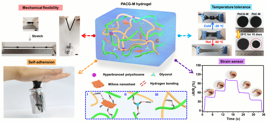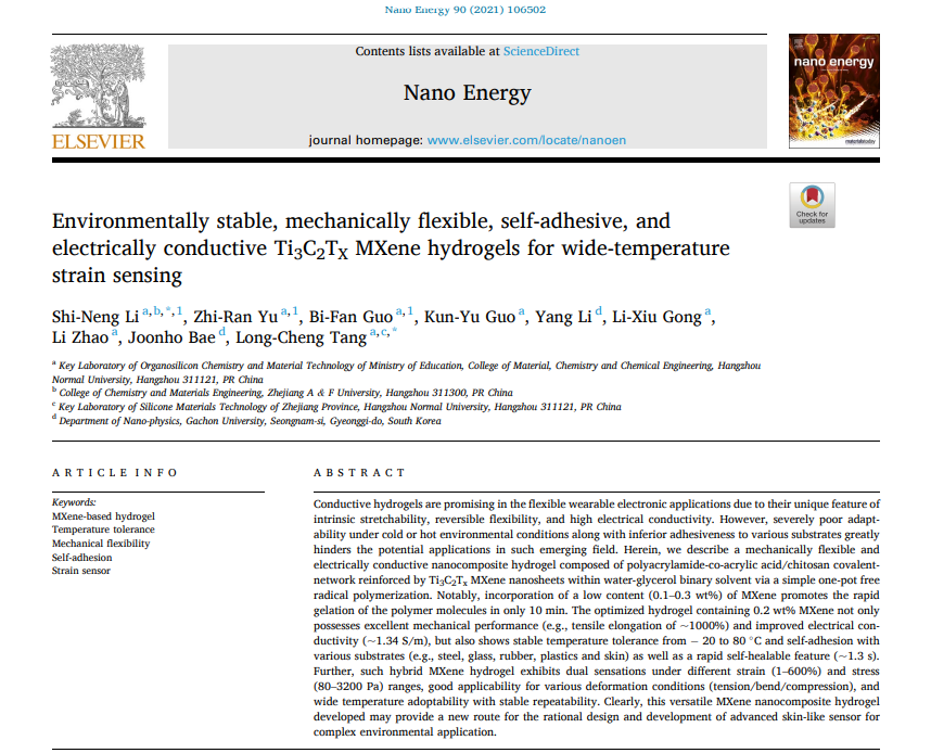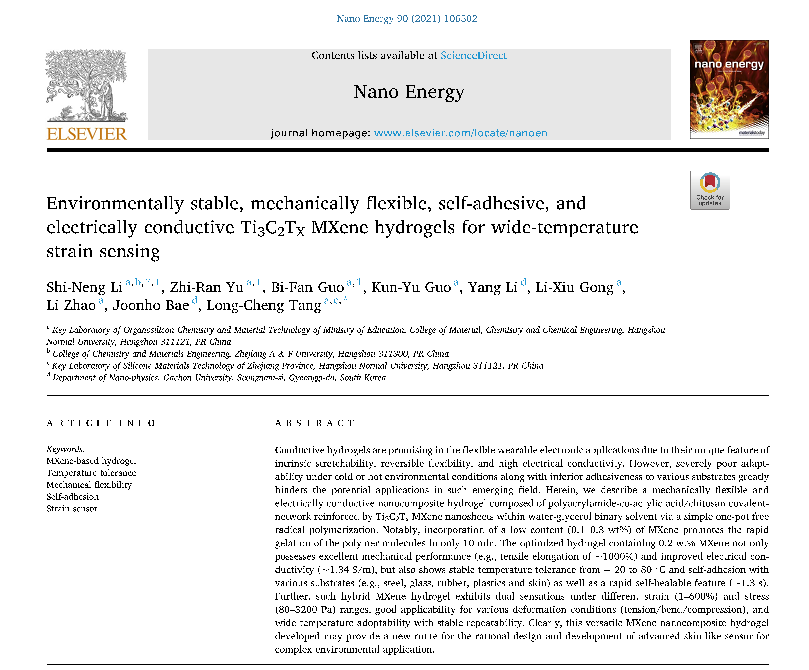 近日,jdb电子 汤龙程研究员团队及其合作者浙江农林大学厉世能博士在国际知名期刊Nano Energy上发表题为“Environmentally stable, mechanically flexible, self-adhesive, and electrically conductive Ti3C2Tx MXene hydrogels for wide-temperature strain sensing”的文章(2021, 90, 106502;IF=17.881)。