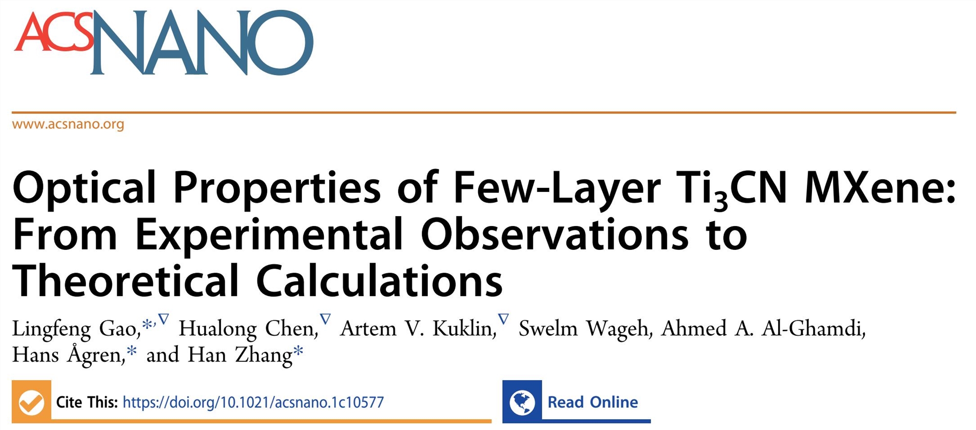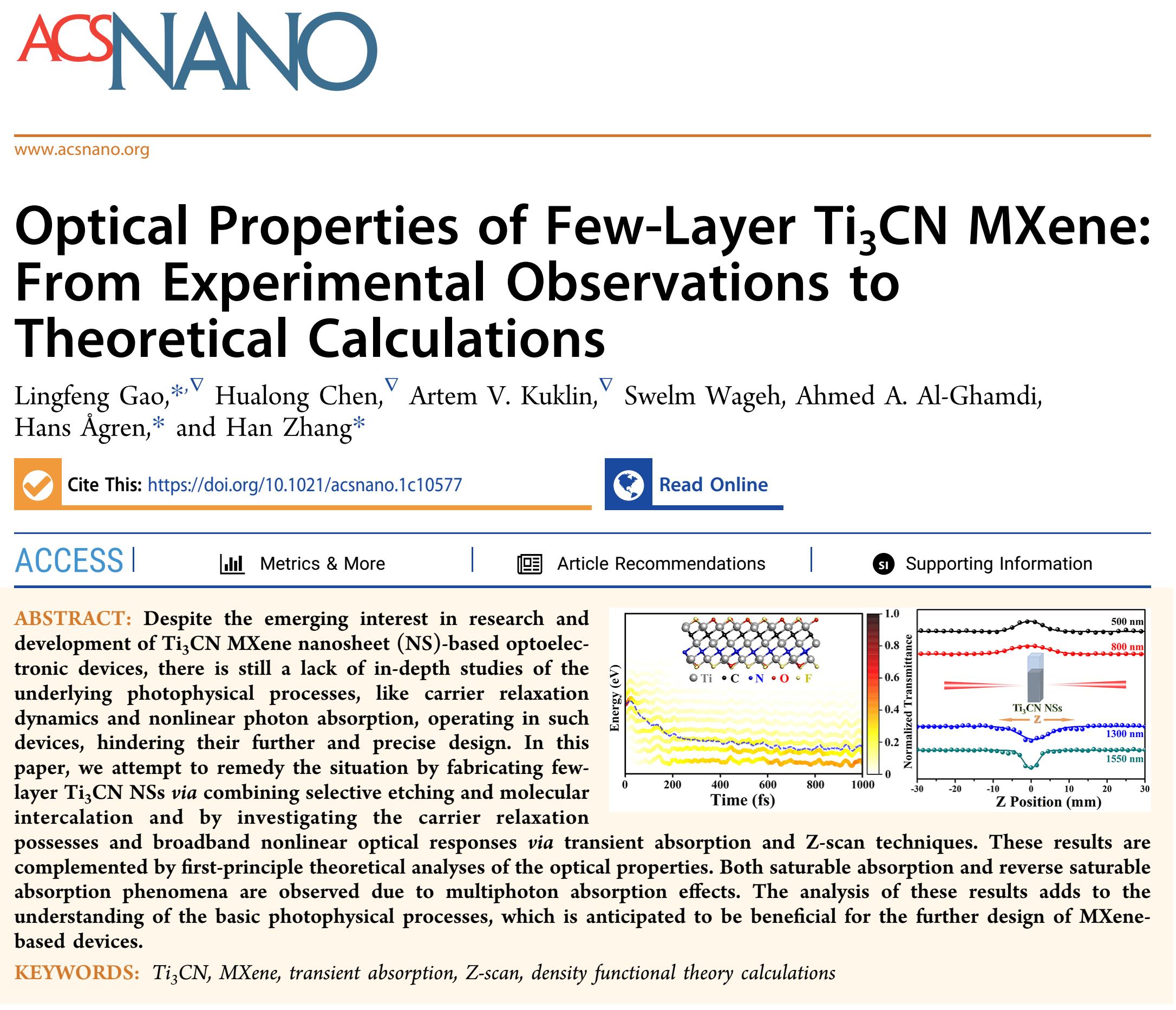 近日,jdb电子 高凌锋副教授与深圳大学张晗教授以及乌普萨拉大学Hans Ågren教授合作系统研究了少层Ti3CN MXene的光学性质。团队近两年在少层MXene材料方面积累了丰富的经验,例如总结了MXene/聚合物复合薄膜(Chem. Mater., 2020, 32, 1703-1747,ESI高被引)和首次提出异质MXene的概念(Adv. Mater., 2021, 33, 2004129),系统对比了Ti3C2和Ti3CN的非线性光学行为(Nanoscale, 2021, 13, 15891-15898),研究了少层Nb2C MXene的非线性光学行为(Small Methods, 2020, 4, 2000250),并以此指导基于Nb2C的飞秒锁模光纤激光器和光电探测器的构建(ACS Nano, 2021, 15, 954-965,ESI高被引;Mater. Today Phys., 2021, 21, 100479)以及拓展少层Nb2C在全光调制(Nanophotonics, 2021, 10, 2617-2623)和可饱和吸收体(Opt. Laser Technol., 2021, 142, 107199)方面的应用等。在本项工作中,团队采用氢氟酸刻蚀和小分子插层的手段制备出具有高质量的少层Ti3CN MXene,随后通过瞬态吸收和Z-扫描技术对Ti3CN MXene的光学性质展开研究,结合第一性原理计算揭示了其载流子动力学和宽带非线性光学响应行为。结果显示,该少层Ti3CN MXene具有超快弛豫时间,其非线性光学行为可随波长的变化而调节,预期在光电器件领域将展现出巨大的应用前景。相关成果以 “Optical Properties of Few-Layer Ti3CN MXene: From Experimental Observations to Theoretical Calculations”为标题发表于国际纳米科技著名期刊《ACS Nano》上。