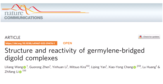 王立亮博士,李志芳教授与南方科技大学常晓勇博士合作在国际著名期刊《自然-通讯》(Nature Communications,IF: 14.919)发表学术论文“Structure and reactivity of germylene-bridged digold complexes”首例锗烯桥连双核负一价化合物的结构与反应性研究。