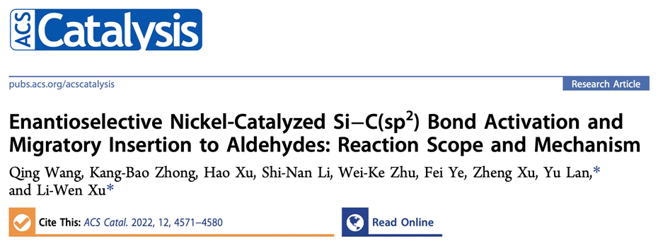 徐利文教授课题组在有机硅化学领域取得新突破,首次实现了不对称镍催化苯并硅杂环丁烷与芳香醛衍生物的[4 + 2]环化/脱硅反应,解决了自该类反应在2006年(Org. Lett., 2006, 8, 483)被发现以来一直悬而未决的立体选择性控制难题,为高对映选择性双芳基甲醇衍生物的合成提供了一种新的高效的途径。同时,通过与重庆大学/郑州大学蓝宇教授课题组合作开展机理研究以及密度泛函理论计算,提出了与先前已报道的推测机制不同的新反应机理以及硅碳键断裂、活化的反应历程。相关研究成果以题为“Enantioselective Nickel-Catalyzed Si-C(sp2) Bond Activation and Migratory Insertion to Aldehydes: Reaction Scope and Mechanism”在美国化学会旗下催化领域顶级学术期刊ACSCatalysis(IF:13.084)上发表,这是该课题组在ACS Catalysis上发表的第四篇论文。ACS Catalysis杂志在化学研究领域深具影响力,被认为是催化领域顶级期刊之一。