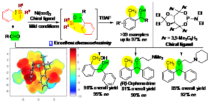 在过去几十年中,结构和功能多样性的有机硅化合物越来越受到关注,因其在稳定性、溶解度、毒性等方面具有独特的优势在合成化学,药物科学以及新材料开发等领域日益重要。特别是立体选择性和/或化学选择性的硅-碳键裂解或成键策略成为设计构建含硅分子多样性和复杂性的有效途径之一。其中,具有固定环张力的硅杂四元环,如硅杂环丁烷(SCBs),由于其特有的环张力及Lewis酸性带来的独特反应性、易处理性及低毒甚至无毒性而越来越受到人们的关注。然而,尽管硅杂环丁烷在硅碳键裂解、转化等方面为合成含硅功能化分子及聚合物提供了很多可能性,但在控制区域选择性、立体选择性等方面仍然具有不小的挑战。迄今为止,通过SCBs的对映选择性扩环方式不对称催化合成Si/O-杂环化合物仍是困难重重,难以高效实现高立体选择性。针对基于硅碳键活化和立体中心的对映选择性形成新硅碳键的官能团转化这一挑战性课题,徐利文教授课题组自2016年以来结合含硅四元环的分子特性研究开发了一系列不对称催化新反应体系(Org. Chem. Front. 2021, 8, 6577; Angew. Chem. Int. Ed. 2020, 59, 790;Coord. Chem. Rev. 2018, 374, 93; Chem. Asian J., 2016, 11, 2867)。最近,徐利文课题组基于多年来在手性配体方面的研究积累(Acc. Chem. Res. 2021, 54, 452),尤其是在开发了TADDOL类手性亚膦酰胺手性配体库的基础上(Nat.Commun. 2020, 11, 2904;Angew. Chem. Int. Ed. 2019, 58, 6747;Angew. Chem. Int. Ed. 2019, 58, 897; Chem. Sci., 2019, 10, 7579),成功利用一种新型的Ni(cod)2/亚膦酰胺催化体系,解决了苯并硅杂环丁烷与芳香醛类衍生物的[4+2]环化反应中的化学及立体选择性控制难题,并进行一步原位脱硅的方式,以直接、高效、高对映选择性的方式合成了一系列在药物分子领域具有潜在应用价值的官能团化双芳基甲醇衍生物(up to 98% yield, 97% ee)。通过密度泛函理论计算表明,不同于以往报道中η2-配位复合物引发的过渡金属催化中的转金属化加成机制,而是通过镍控制的Si-C(sp2)键活化以及苯甲醛上的氧中心诱导活化形成高价硅中心的模式,实现了可控地迁移插入Ni-Si键的反应,该过程为控制对映选择性的决定性步骤。