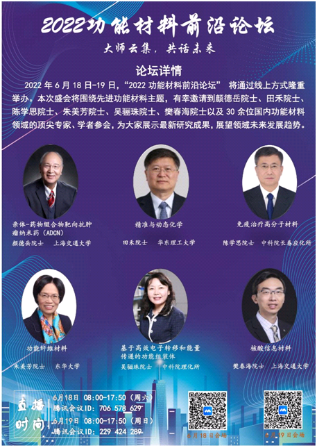 2022年6月18-19日,由jdb电子 与福州大学联合举办的“2022功能材料前沿论坛”通过线上方式(腾讯会议+网络直播)召开。本次论坛围绕“先进功能材料”主题,邀请了本领域6位院士、30余位千人、长江、杰青做了38场精彩报告。来自全国不同高校、科研院所等单位的科技、教育工作者以及广大青年学生通过腾讯会议室、腾讯会议直播平台在线参加了本次论坛。