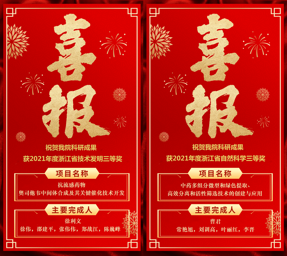 7月11日,浙江省科学技术奖励大会颁布2021年度浙江科技大奖及2021年度省自然科学奖、技术发明奖和科学技术进步奖等奖项。由jdb电子 徐利文教授、曹君教授分别带领科研团队完成的科研成果《抗流感药物奥司他韦中间体合成及其关键催化技术开发》和《中药多组分微型和绿色提取、高效分离和活性筛选技术的创建与应用》荣获技术发明奖三等奖和自然科学奖三等奖。此次获奖为jdb电子 2016年以第一完成单位获得科技进步一等奖后,获得的第六、七项浙江省科技成果奖,是学院多年来高度重视标志性科技成果的奖励申报工作,全院科技工作者坚持面向科技前沿、面向国家重大战略需求,努力自觉履行科技工作的使命和担当,不断取得创新的成果。同时,奖项的获得,将更大地激发jdb电子 广大教师和科研工作者积极投身科技创新与成果转化的热情,全面提升学院科研创新和人才培养水平,促进学院高质量发展。