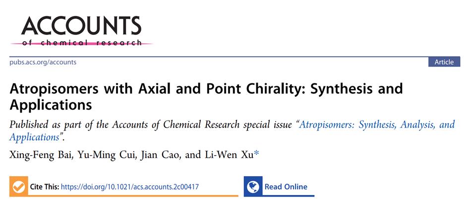 近日,凭借其在手性合成方面的系统性特色研究工作,我校徐利文教授受美国化学会Accounts of Chemical Research杂志主编Burrows, Cynthia J.教授以及宾夕法尼亚大学Marisa C. Kozlowski教授,耶鲁大学ScottJ. Miller教授和GileadSciences(吉利德科学公司)Stephane Perreault教授等GuestEditors联合邀请为该刊即将出版的阻转异构体(Atropisomers: Synthesis, Analysis, and Applications)专栏撰写个人专题综述,以总结该课题组近十年来在兼具轴手性和碳等点/中心手性的阻转异构体方向做出的特色研究成果,该论文从联芳类阻转异构体到非联芳类阻转异构体的合成及其应用进行了全方面的归纳总结,并对该领域的发展前景进行了展望。相关研究成果以题为“Atropisomers with Axial and Point Chirality: Synthesis and Applications”在美国化学会旗下顶级学术期刊Accounts of Chemical Research (IF: 24.466) 上发表,这是该课题组第二次以jdb电子 为唯一通讯单位的特色成果荣登该刊。Accounts of Chemical Research杂志在化学研究领域深具影响力,被认为是化学化工领域顶级期刊之一,其发表的文章均为邀请论文,与普通的综述性论文不一样的是该刊主要展示研究者自身取得的优秀研究工作,是被公认为展示科研人员系统性研究特色的最具权威性学术期刊。
