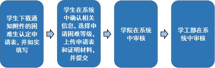 本科生困难生认定工作在“学生工作管理服务平台”(以下简称“学工平台”)(//xgxt.jdbdianziyouxi.com/)中进行。具体流程如下: