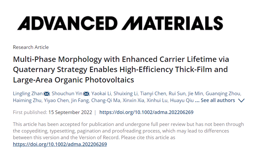 近日,我校邱化玉团队在有机光伏器件效率,厚膜和大面积产业化应用方面取得最新进展,相关研究发表于著名国际期刊Advanced Martials(IF = 32.086),论文题目为“Multi-Phase Morphology with Enhanced Carrier Lifetime via Quaternary Strategy Enables High-Efficiency Thick-Film and Large-Area Organic Photovoltaics”。