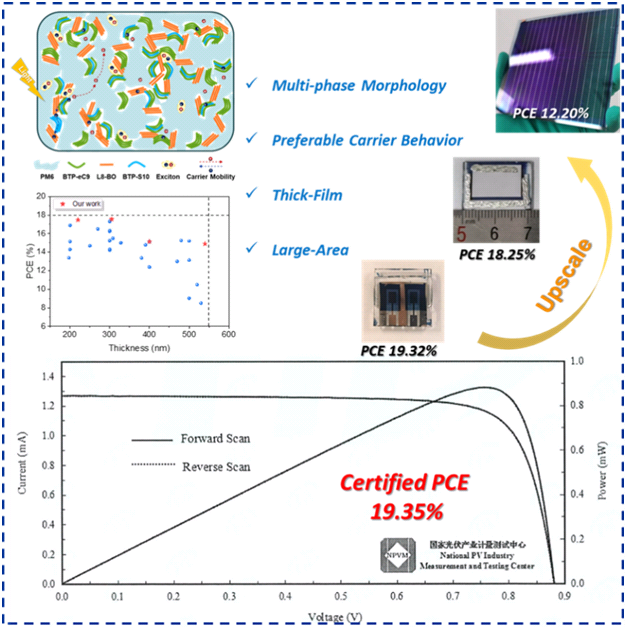 有机光伏(OPVs)作为一种高效清洁能源器件,具有成本低、重量轻、溶液可加工性、半透明等独特优势,在智能窗口和柔性可穿戴器件中具有巨大应用潜力。随着高效材料的开发和器件工程的探索,单结OPVs的光电能量转换效率(PCE)已经超过19%。然而,绝大多数高性能OPVs器件的活性层厚度和面积较小,分别约为100 nm和0.05 cm2。这主要是因为一方面由于载流子迁移率低,在OPVs体系中增加活性层的厚度通常会导致严重的电荷复合;另一方面通过刮涂或槽模涂布处理器件将经历更长的相变时间,使得相分离尺寸将进一步放大,导致厚膜和大面积器件的效率显著下降。