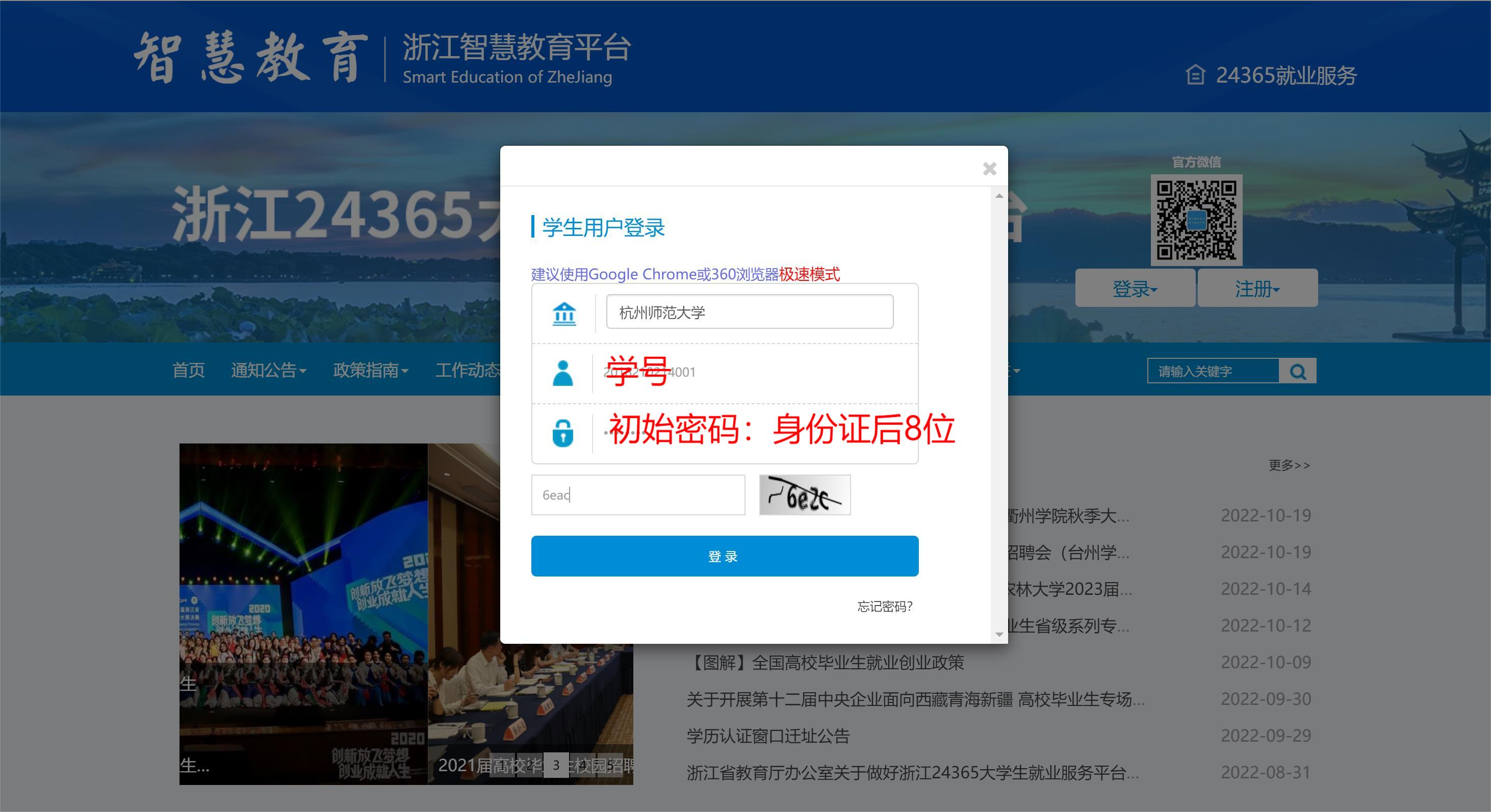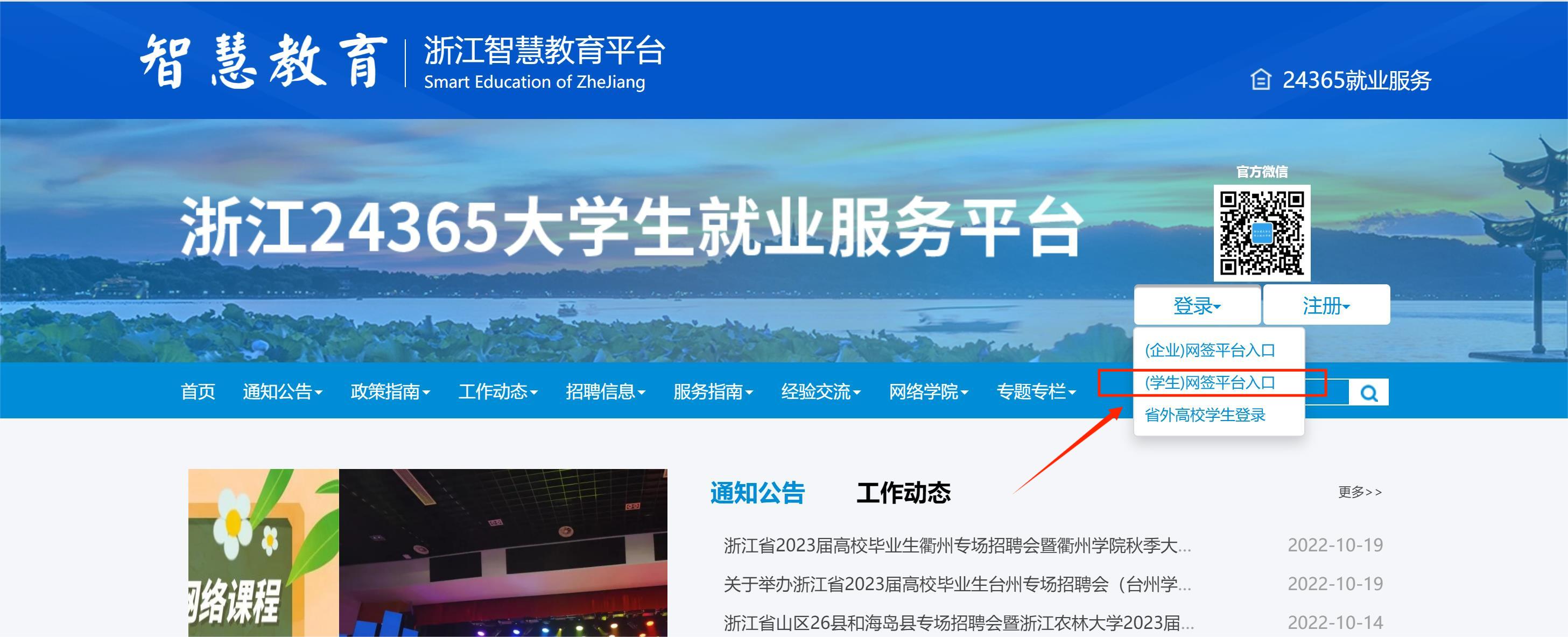 1. 登录“浙江24365大学生就业服务平台”(//www.ejobmart.cn),选择“登录”“(学生)网签平台入口”,选择学校jdb电子 ,初始登录名为学号,登录密码为身份证后8位。