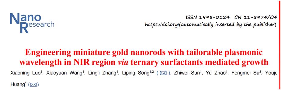 黄又举教授团队通过三元表面活性剂调控纳米晶核的成长,精准合成了超小纳米金棒,其可定制等离子体波长在近红外区。相关研究结果以“Engineering miniature gold nanorods with tailorable plasmonic wavelength in NIR region via ternary surfactants mediated growth”为题发表在Nanoresearch (Q1, IF=10.269)。DOI: org/10.1007/s12274-022-5214-5。