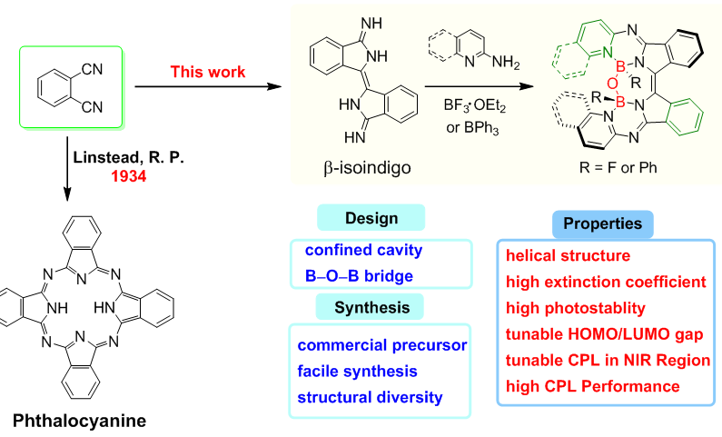 近期,针对上述难题,jdb电子 卢华课题组设计合成了一系列基于-异靛蓝骨架的B-O-B桥联Aza-BODIPY类似物(BIABs)。二亚氨基-β-异靛蓝与异芳胺缩合反应产生限域配体腔,限制在配体腔中的两个相邻BF2或BPh2单元随后通过自发水解生成B–O–B桥。β-异靛蓝单元和B–O–B受限腔中的位阻产生满足螺旋性要求的扭曲构象,从而获得了优异的光谱和光学活性性质,如高摩尔吸光度、优异的光稳定性、近红外发光和强手性光学响应等。理论计算显示,由于B-O-B桥联螺旋结构和π扩展共轭增强了跃迁磁偶极距|m|,获得了发光在近红外区域可调且具有高glum (1.3 × 10−3)和高BCPL (11.5 M−1 cm−1)的有机分子材料。该合成方法简洁、起始原料为邻苯二腈,这也是广泛研究的功能分子酞菁的前驱体,因此,此方法为丰富近红外螺旋烯类化合物提供了新策略,为手性调控提供更多的灵活性。