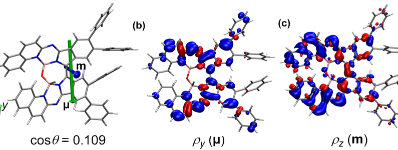 综上,本文设计了一种简单的合成策略,构建了一类具有螺旋构象的近红外Aza-BODIPY类似物。其中喹啉稠合化合物5b在708nm处BCPL达11.5 M-1 cm-1,是目前700-900nm区域内最高值。理论计算表明,喹啉稠合的g远大于吡啶稠合的主要原因是π扩展共轭增强了跃迁磁偶极距|m|,同时也减小了跃迁电偶极矩|μ|以及两者之间的夹角。本合成方法的起始材料与酞菁相同,结构多样。这一工作将进一步促进近红外手性有机分子材料的发展,为构筑高性能CPL分子材料提供新的思路和方法。