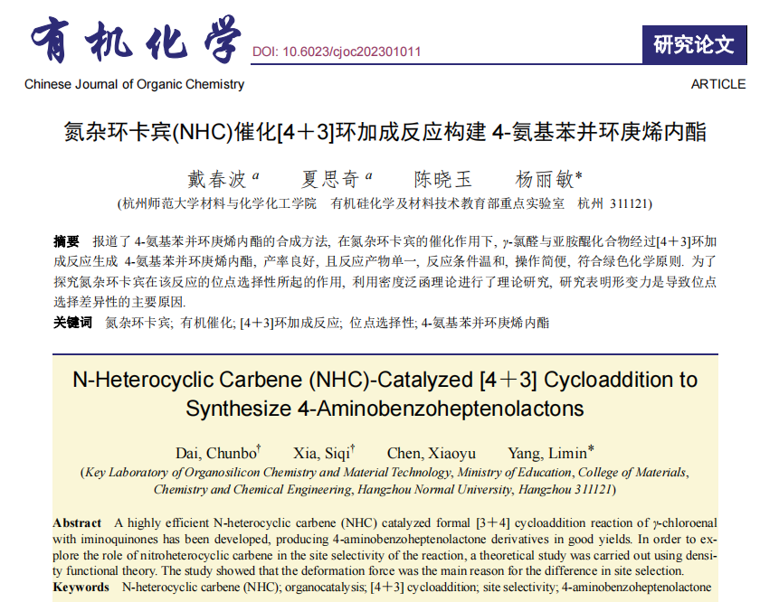 近日,jdb电子-jdb电子游戏 杨丽敏副教授课题组受邀在《有机化学》期刊三八妇女节专刊发表学术论文“N-Heterocyclic Carbene (NHC)-Catalyzed [4+3] Cycloaddition to Synthesize 4-Aminobenzoheptenolactons ”.