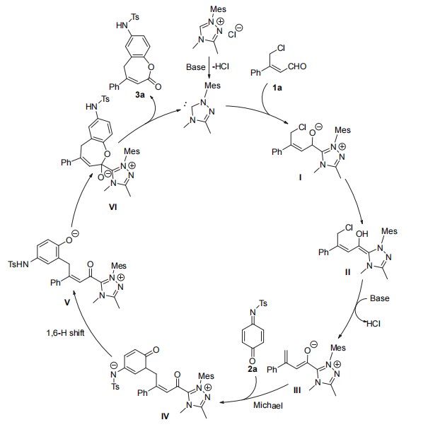 杨丽敏团队一直致力于发展新颖的NHC催化方法来制备具有潜在生物活性和应用前景的手性化合物。在前期工作基础上,作者设想:NHC对底物的醛基化合物的γ-位点进行活化,生成乙烯基烯醇盐中间体。该中间体与亚胺醌进行反应。机理概述如下:首先,将NHC催化剂亲核添加到γ-氯醛1a中,然后1,2-H从碳迁移到氧,得到Breslow中间体II。然后,Breslow中间体II经历了互变异构化和C-Cl键断裂,烯醇烯酮重排和1,5-H位移,以及由提供烯醇化乙烯酯(二烯)III的碱捕获γ-质子。最后,烯醇化乙烯酯III与对碳-醌基团上的亚氨基醌衍生物2a进行逐步环加成反应,得到4-氨基苯并庚内酯3a并释放NHC催化剂。(图1)