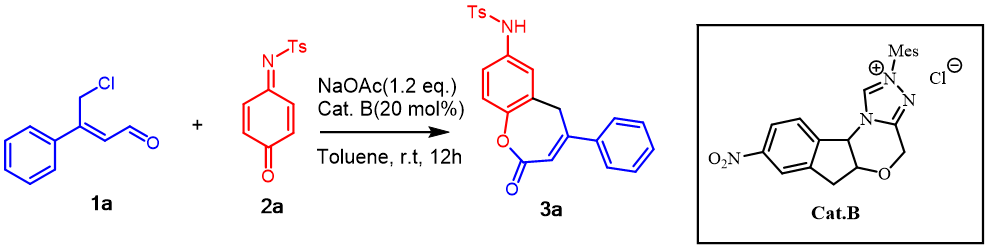 鉴于此,作者通过对手性NHC催化剂,碱和溶剂的一系列筛选,最终确定了苯基取代的γ-氯醛1a在20 mol%氮杂环卡宾B的催化下,以醋酸钠(NaOAc)作为碱,在甲苯(Toluene)中,反应48小时,可以以74%的收率,获得目标产物3a(图2)。
